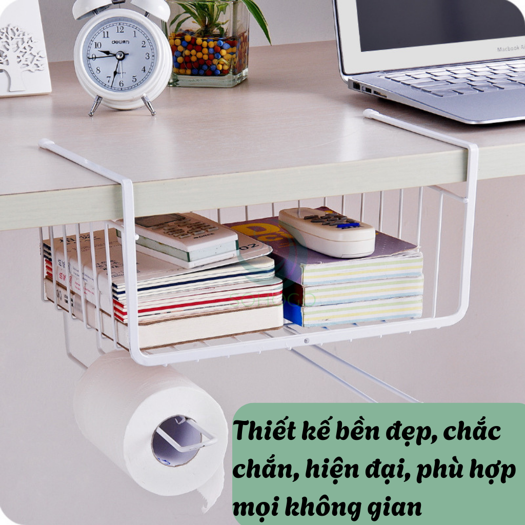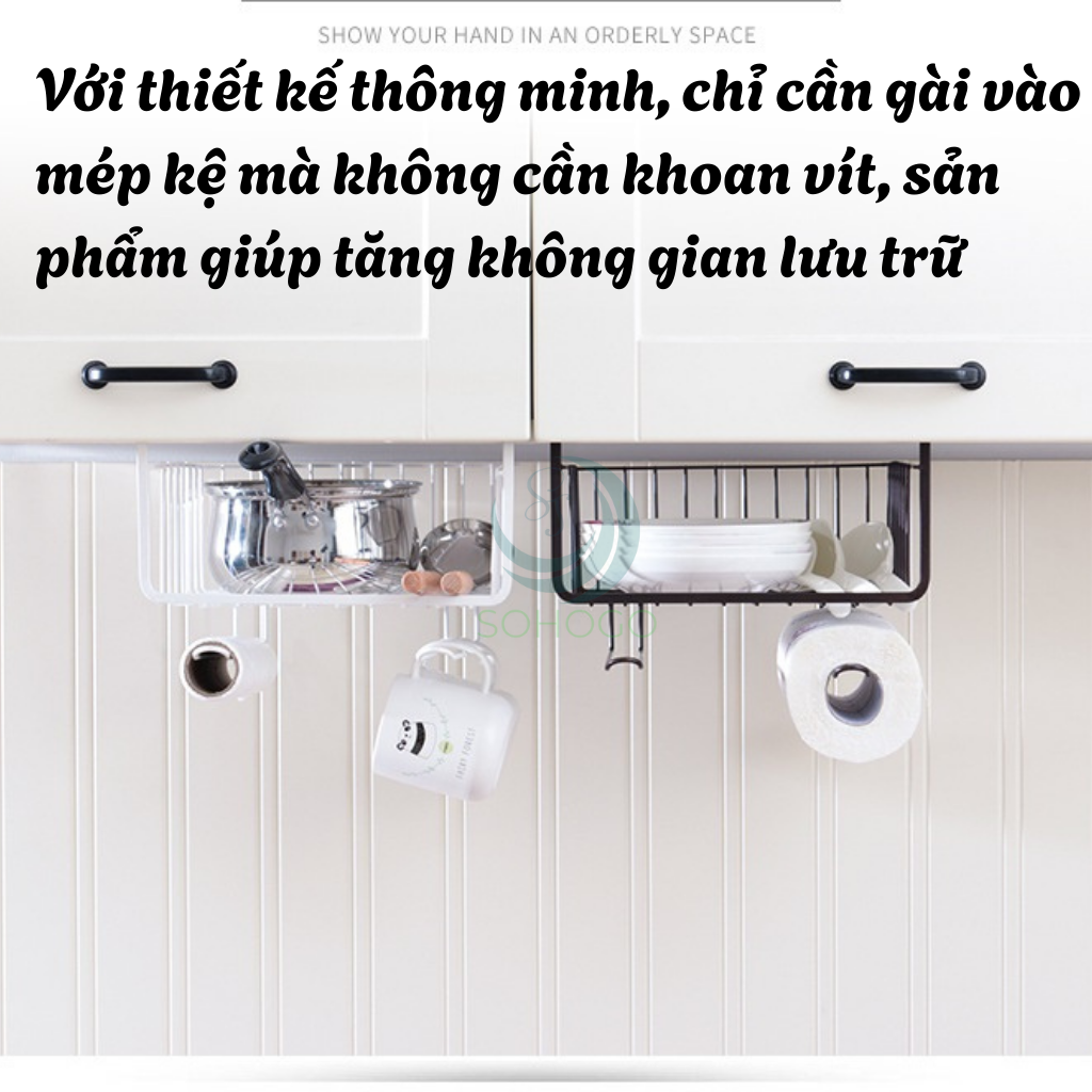 Mua tại Tiktoksống chỉ trong 1 nốt nhạc! ƯU ĐIỂM NỔI BẬT: Treo được bát đĩa, giấy lau, lọ gia vị, cốc chén, tai nghe, phụ kiện... Dùng cho nhà bếp, phòng ngủ, bàn học, tủ quần áo... Thiết kế bền đẹp, chắc chắn, hiện đại, phù hợp mọi không gian Không cần khoan đục – chỉ cần gài vào gầm kệ Kích thước: 28 x 25 x 19.5 cm Màu sắc: Đen / Trắng thời thượng Chất liệu: Sắt sơn tĩnh điện – chống gỉ, siêu bền Mô tả chi tiết Kệ treo đa năng dưới kệ là sản phẩm thông minh giúp tận dụng tối đa không gian dưới kệ tủ bếp, tủ sách, bàn làm việc hoặc tủ quần áo. Với thiết kế thông minh, chỉ cần gài vào mép kệ mà không cần khoan vít, sản phẩm giúp tăng không gian lưu trữ và giữ cho không gian sống của bạn luôn gọn gàng, ngăn nắp.