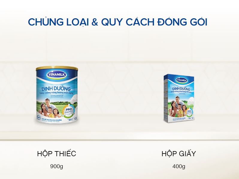 Giới thiệu Vinamilk Dinh Dưỡng với hệ dưỡng chất PRO – ENERGY giúp cung cấp năng lượng cần thiết cho cơ thể, hỗ trợ hấp thu Canxi tạo hệ xương chắc khỏe, cùng với sự kết hợp độc đáo của chất xơ FOS giúp cải thiện sức khỏe hệ tiêu hóa.    Công dụng CUNG CẤP NĂNG LƯỢNG CẦN CHO CƠ THỂ: • Giàu protein: cung cấp đủ năng lượng, đáp ứng nhu cầu hoạt động của cơ thể • MCT: là axit béo mạch trung bình, dễ hấp thu và chuyển hóa nhanh thành năng lượng, không tích trữ thành mỡ như các chất béo thông thường • Vitamin nhóm B: hỗ trợ chuyển hóa các chất dinh dưỡng thành năng lượng theo nhu cầu của cơ thể HỆ XƯƠNG CHẮC KHỎE: • Canxi, Phốt pho, Magie và Kẽm: là các dưỡng chất thiết yếu để xây dựng 1 hệ xương chắc khỏe • Vitamin D: hỗ trợ quá trình chuyển hóa hấp thu Canxi từ thực phẩm vào cơ thể HỆ TIÊU HÓA KHỎE MẠNH: Bổ sung chất xơ hòa tan FOS giúp tăng cường hệ vi khuẩn có lợi trong đường ruột, hỗ trợ sức khỏe hệ tiêu hóa và giảm táo bón   Đối tượng sử dụng: Vinamilk Dinh Dưỡng phù hợp với mọi lứa tuổi, giúp trẻ em tăng trưởng chiều cao, người bệnh khắc phục được tình trạng suy nhược và là nguồn năng lượng dồi dào cho những người hoạt động trí não hoặc có nhu cầu vận động cao. Thành phần dinh dưỡng Sữa bột nguyên chất (84%), đường (9,2%), chất xơ hòa tan oligofructose, chất béo MCT, chất nhũ hóa (lecithin đậu nành), hương vani tổng hợp dùng cho thực phẩm. THÔNG SỐ SẢN PHẨM  Giá trị dinh dưỡng trung bình Trong 100g bộtTrong 1 ly đã phaĐơn vịNăng lượng420160kCalChất béo248,2gMCT2,50,85mgChất đạm19,36,6gHydrat Carbon43,214,7gĐộ ẩm30gKhoáng chất   Natri26088mgKali980333mgClorid490167mgCanxi720245mgPhốt pho540184mgMagiê5820mgKẽm2,40,82mgĐồng0,350,05mgVitamins   Vitamin A1800612I,UVitamin D37,22,45I,UVitamin C9,13,1mgVitamin B10,20,07mgVitamin B21,40,48mgAcid folic35,812,2mcgAcid pantothenic1,30,44mgVitamin B121,80,61mcgBiotin20,77,04mcgCholin15659,3 Hướng dẫn sử dụng