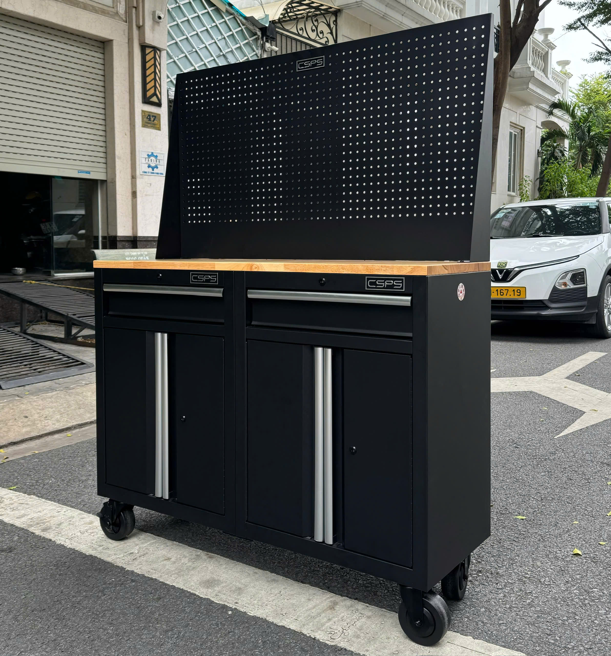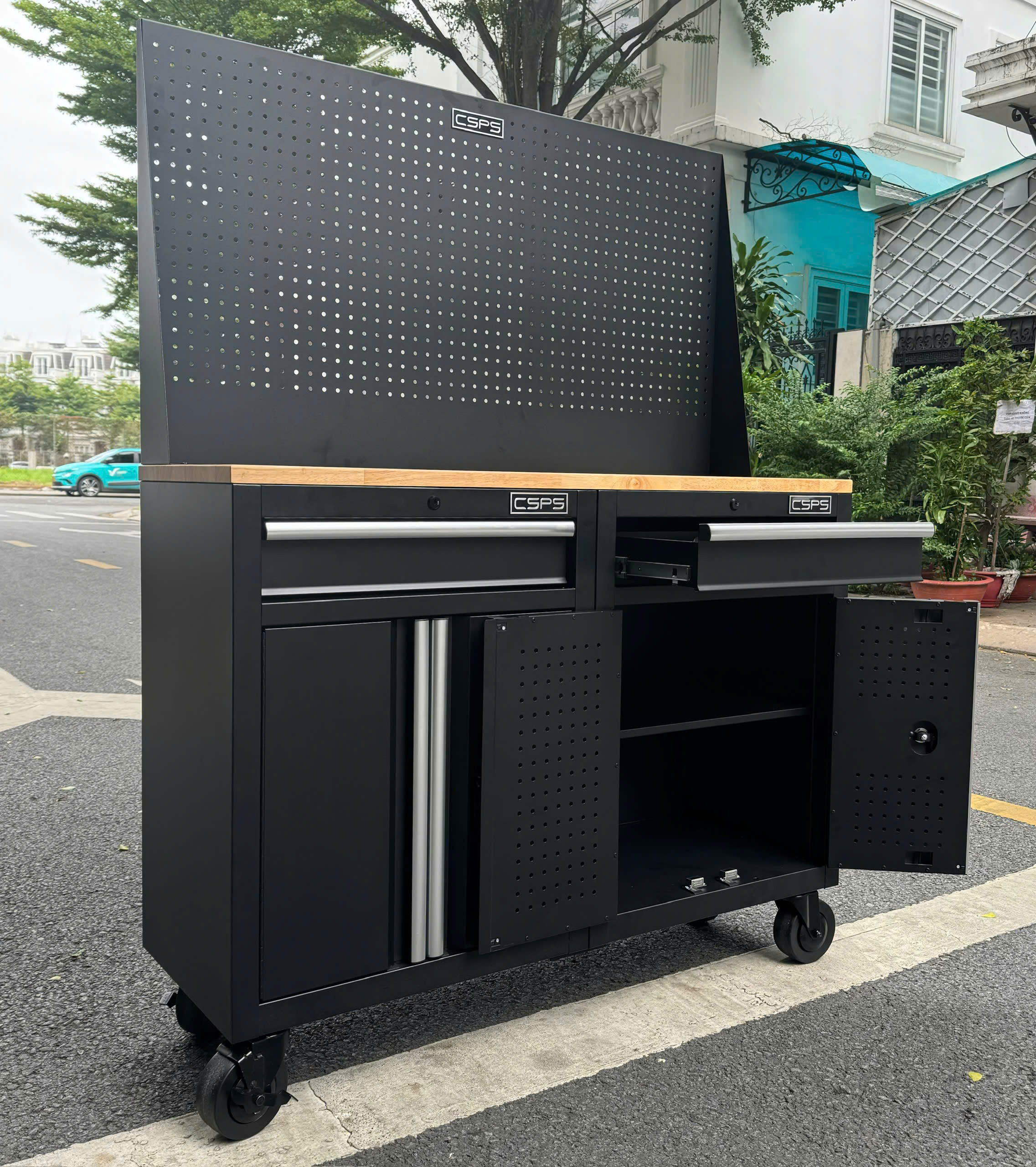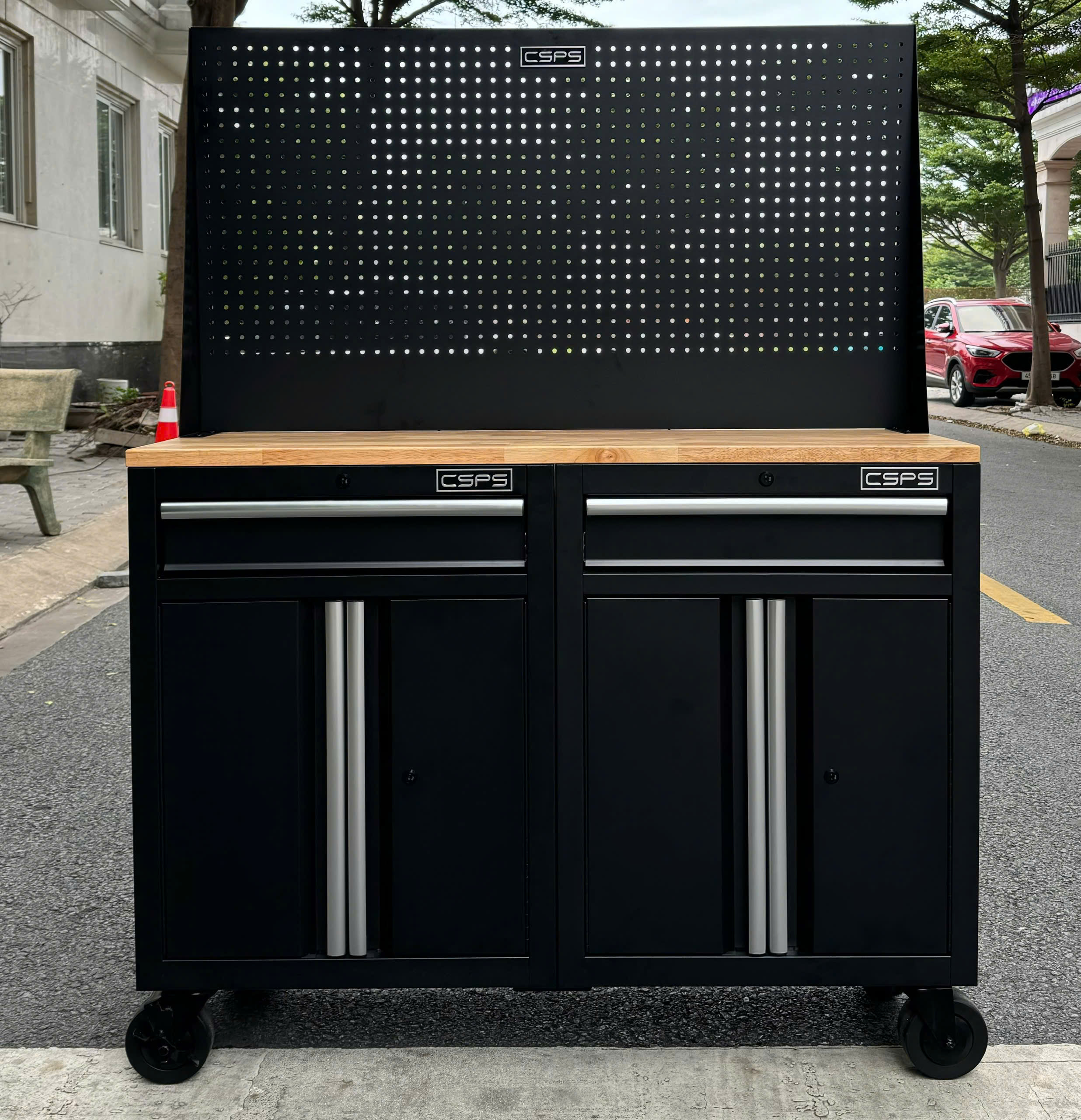 ✨Bộ 2 Tủ dụng cụ CSPS 122cm màu đen mặt ván gỗ kèm vách lưới - 02 hộc kéo (tay cầm trắng)