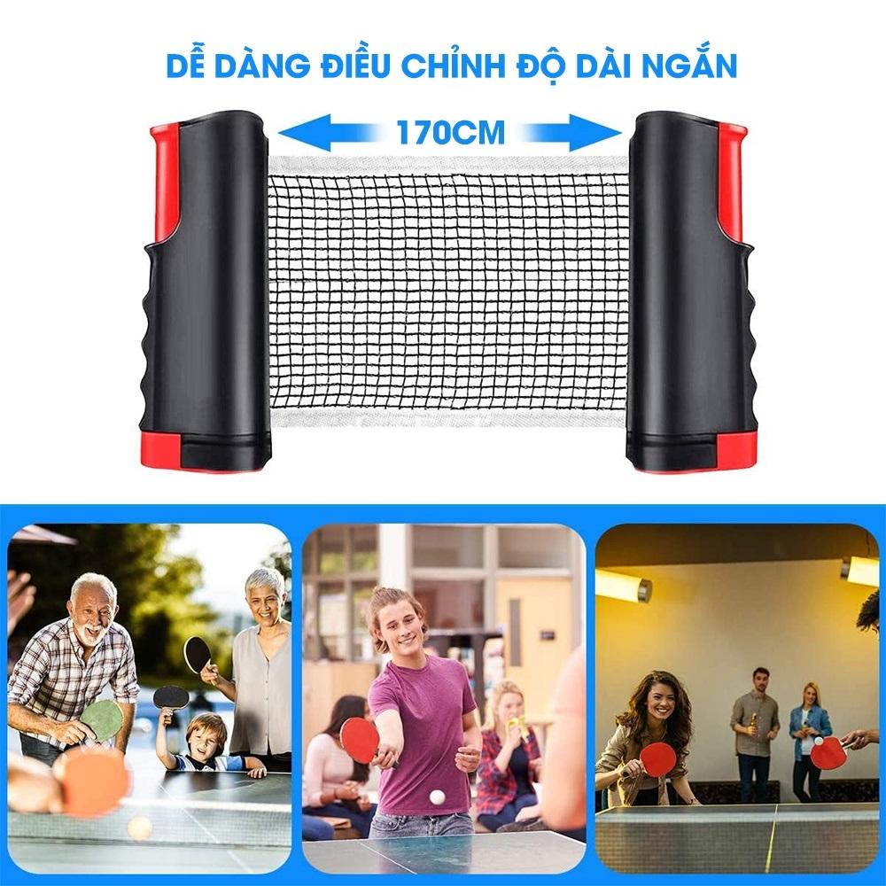 Cọc lưới đa năng. Bạn không có chỗ cho bàn bóng bàn? Cọc lưới thu rút tự động có thể kẹp vào bất kỳ mặt phẳng nào và thu gọn để lưu trữ. Lưới có chiều dài lên tới 1,7m và chiều rộng lưới là 14cm. Lưới chắc chắn với thiết kế chống trượt và giữ cố định.