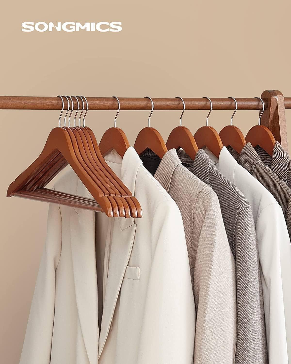 Một món đồ bắt mắt trong tủ quần áo của bạn: trên những chiếc móc treo này, gây ấn tượng với màu óc chó sẫm và bề mặt nhẵn dễ chịu, những bộ quần áo của bạn luôn trông như mới mua và luôn sẵn sàng để sử dụng.