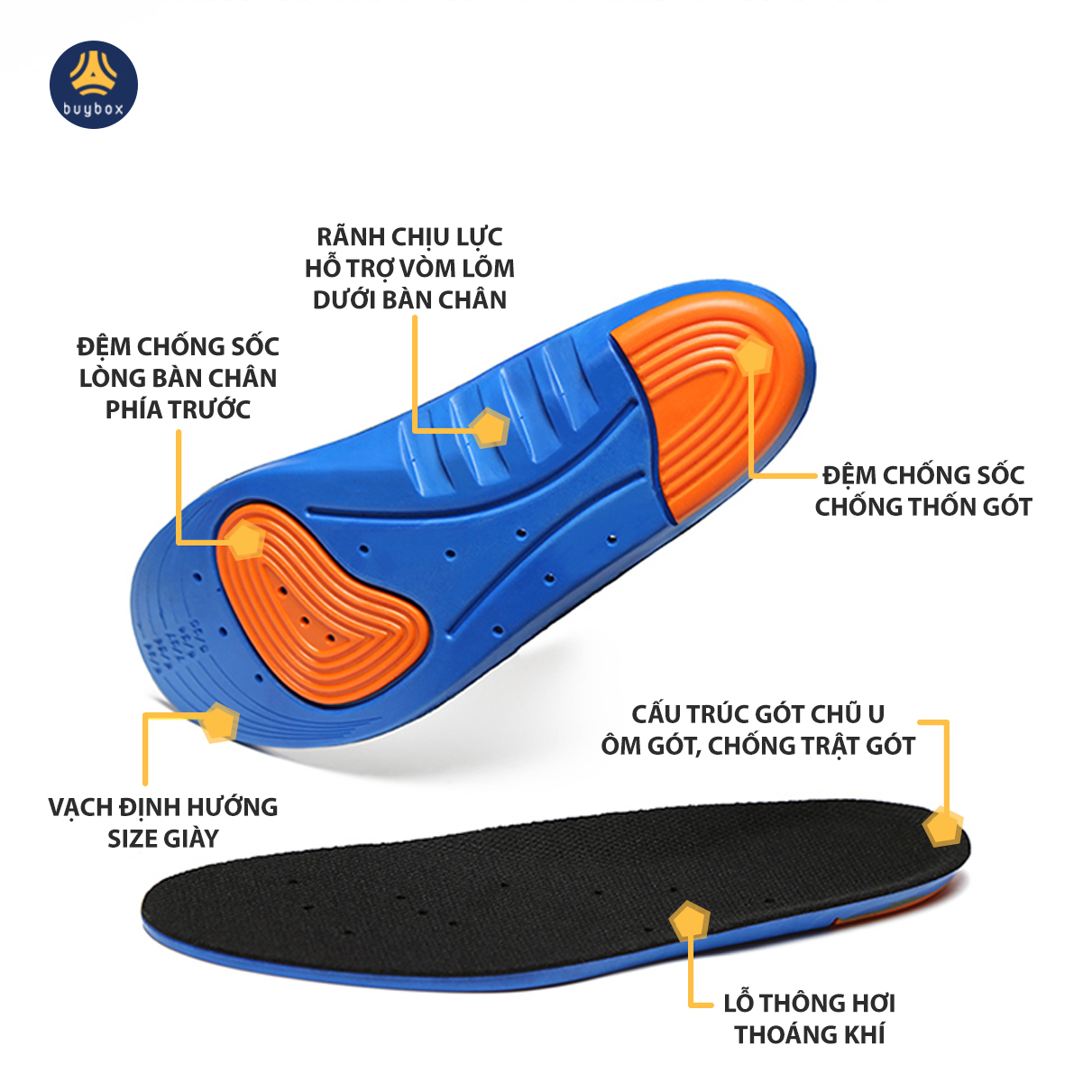 LÓT GIÀY THỂ THAO EVACÔNG DỤNG NỔI BẬT Lót giày thể thao được thiết kế rãnh giảm sốc ở mặt dưới giúp giảm mỏi lòng bàn chân và gel chống thốn gót Lót giày được dập lỗ thông hơi và sử dụng b...