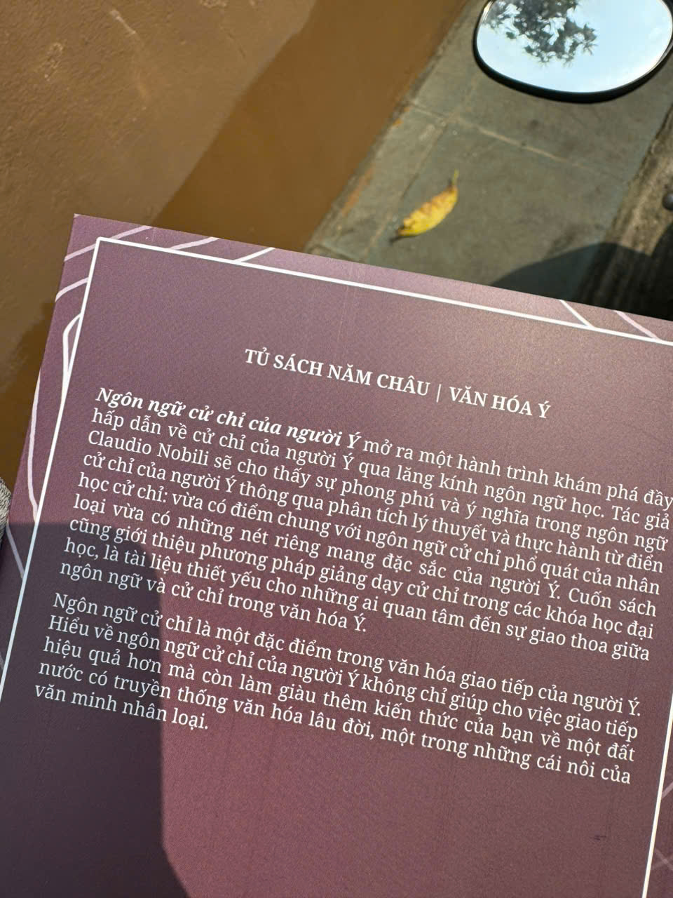 Mua tại TiktokHàng năm Đại sứ quán Italia tại Hà Nội tổ chức nhiều chương trình sự kiện và hoat động văn hóa phong phú nhằm củng cố hơn nữa tình hữu nghị gắn bó giữa hai dân tộc. Đặc biệt, việc quảng bá xuất bản phẩm của Ý là một công cụ ngoại giao văn hóa rất hiệu quá. Vì lý do đó, Đại sứ quán đã quyết định đồng hành cùng dự án Tů sách Năm Châu. Sáng kiến tuyệt vời này do Công ty Cổ phân Xuất bản Khoa học và Giáo dục Thời Đại (TIMES) phối hợp Khoa tiếng Italia, Trường Đại học Hà Nội thực hiên nhằm đáp ứng nhu cầu tìm hiểu về đất nước Italia ngày càng cao tại Việt Nam và thúc đẩy truyền bá văn hóa và ngôn ngữ Ý tới độc giả của đất nước hình chữ S. Nhóm thành viên dự án đã lựa chọn kỹ lưỡng các cuốn sách của các tác giả Ý, góp phần làm sâu sắc thêm hiểu biết về đất nước và con người Ý. Thông qua những ấn phẩm dịch trong Tủ sách, người đọc có thêm những trải nghiệm đặc sắc về văn hóa Ý. Cuốn “Bản sắc văn hóa Ý” của Giuseppe Giliberti đem đến cho độc giả một cái nhìn tinh tế vê bản sắc văn hóa của Ý. Trong khi đó, cuốn Ngôn ngữ cử chỉ cùa người Ý của Claudio Nobili mang lại "những phân tích sâu sắc vê ngôn ngữ cử chỉ Ý" và giúp người đọc hiểu rõ hơn ý nghĩa của cử chỉ trong giao tiếp của người Ý. Một trong những yếu tố quan trọng tạo nên sức mạnh mềm của nước Ý đó ẩm thực. Cuốn “Vị đắng trong ấm thực Ý của Massimo Montanari thảo luận về vai trò đặc biệt của hương vị này trong ẩm thực Ý. Cuối cùng, vớii “Lược sử thời trang Ý” của Maria Giuseppina Muzzarelli, độc giả Viêt Nam sẽ có cơ hội khám phá sự phát triển của ngành thời trang Ý - một hình thức biểu hiện văn hóa độc đáo, giao thoa giữa nghệ thuật và thủ công đã trở thành một phần không thể tách rời trong hình ảnh của nước Ý trên toàn thế giới.