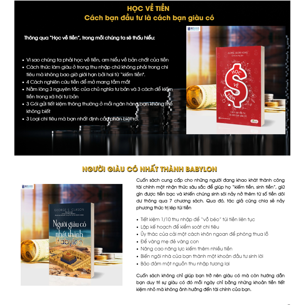 Người giàu có nhất thành Babylon Cuốn sách cung cấp cho những người đang khao khát thành công tài chính một nhận thức sâu sắc để giúp họ “kiếm tiền, sinh tiền”, giữ gìn được tiền bạc và khiến chúng sinh sôi nảy nở thêm từ số tiền dôi dư thông qua 7 chương sách
