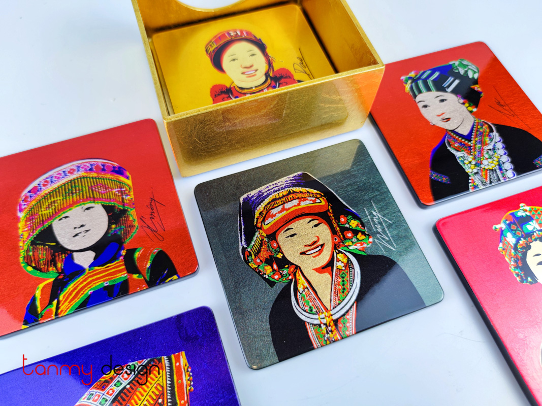 ✨BỘ 6 LÓT CỐC SƠN MÀI HÌNH CÁC CÔ GÁI DÂN TỘC.