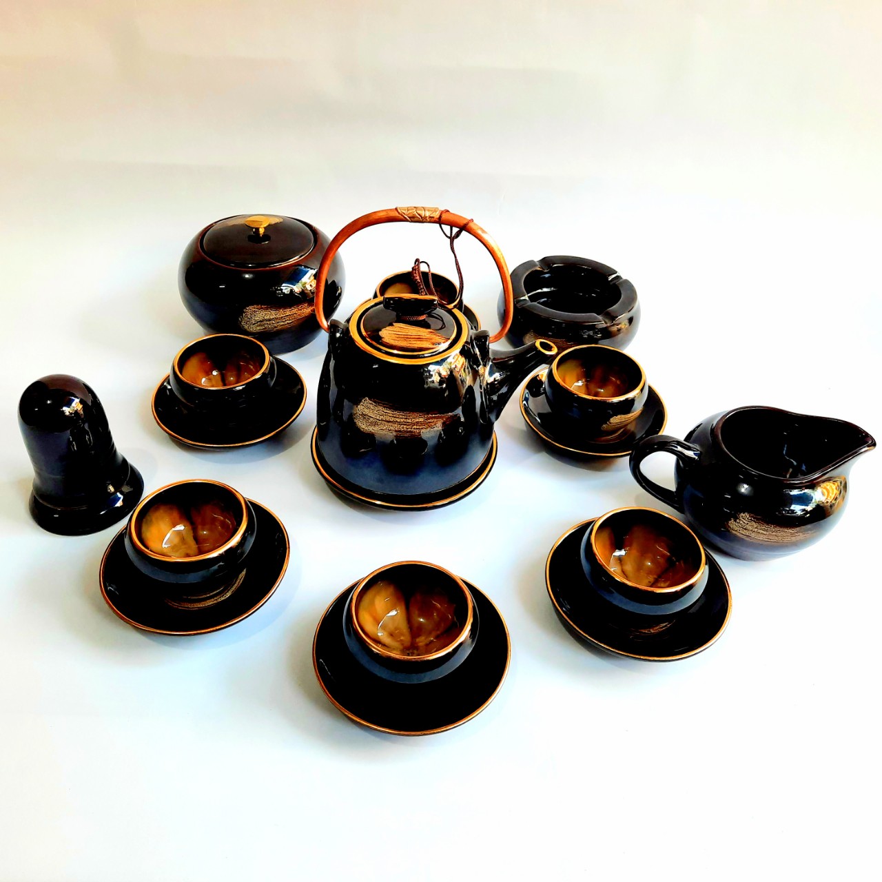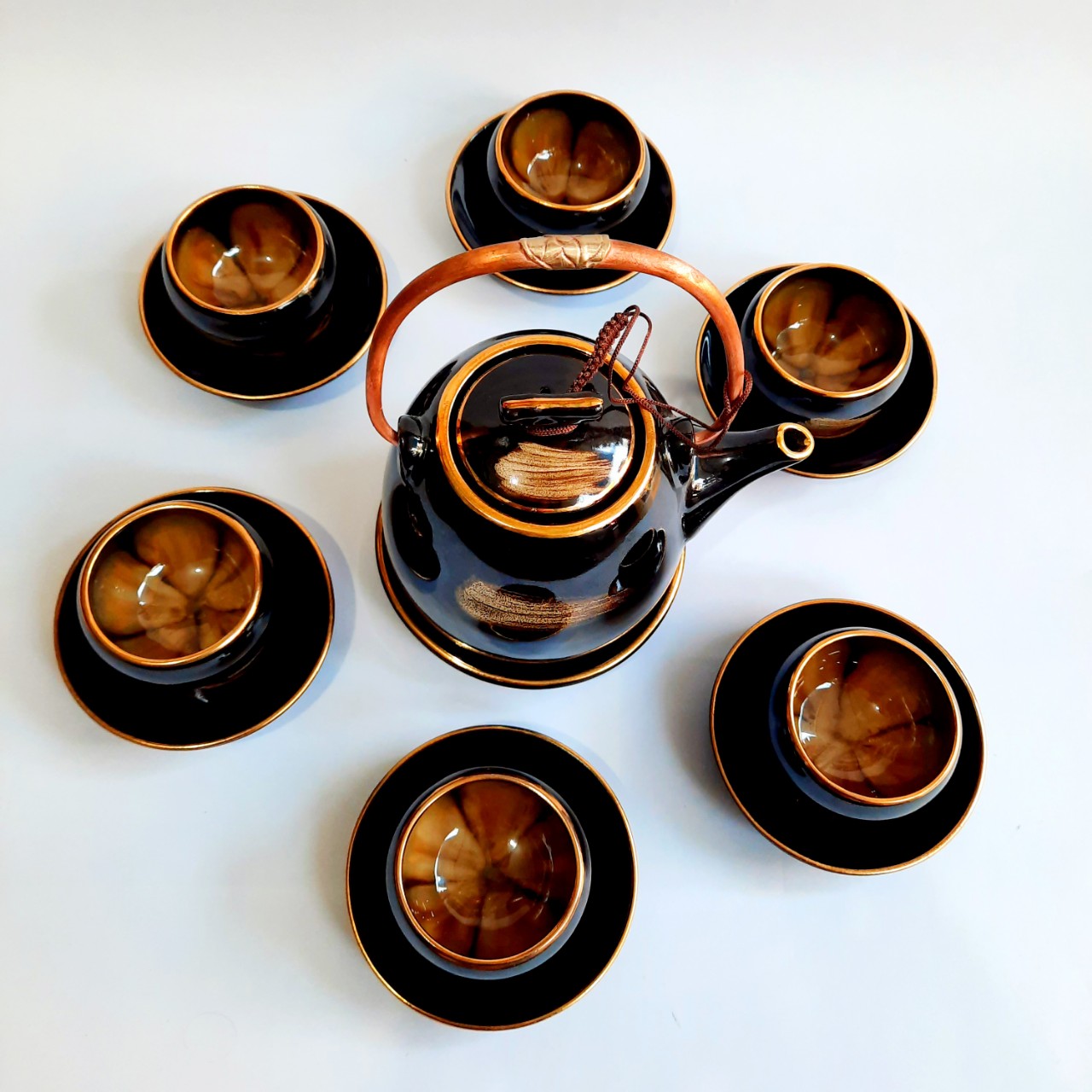 Bộ ấm chén men nâu gồm: 6 chén 1 ấm 7 đĩa. Màu men, nâu, xanh lòng trắng, xanh, dùng để thưởng trà trưng bày nghệ thuật. Sản xuất tại Bát Tràng, đun ở nhiệt