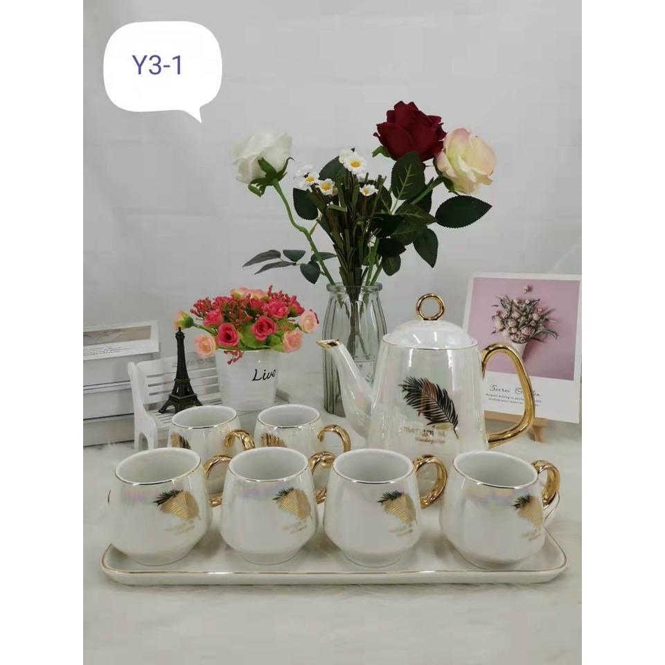 ✨BỘ ẤM CHÉN KÈM KHAY SỨ PHA TRÀ CÀ PHÊ HỌA TIẾT LÔNG VŨ MÀU TRẮNG ÁNH TRAI