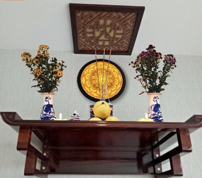 _ Bộ bàn thờ chung cư được làm bằng chất liệu gỗ sồi tự nhiên 100% _ Kích thước bàn thờ 69×48cm × ám khói khung gỗ sồi 31×41cm + chữ phúc hay hoa văn