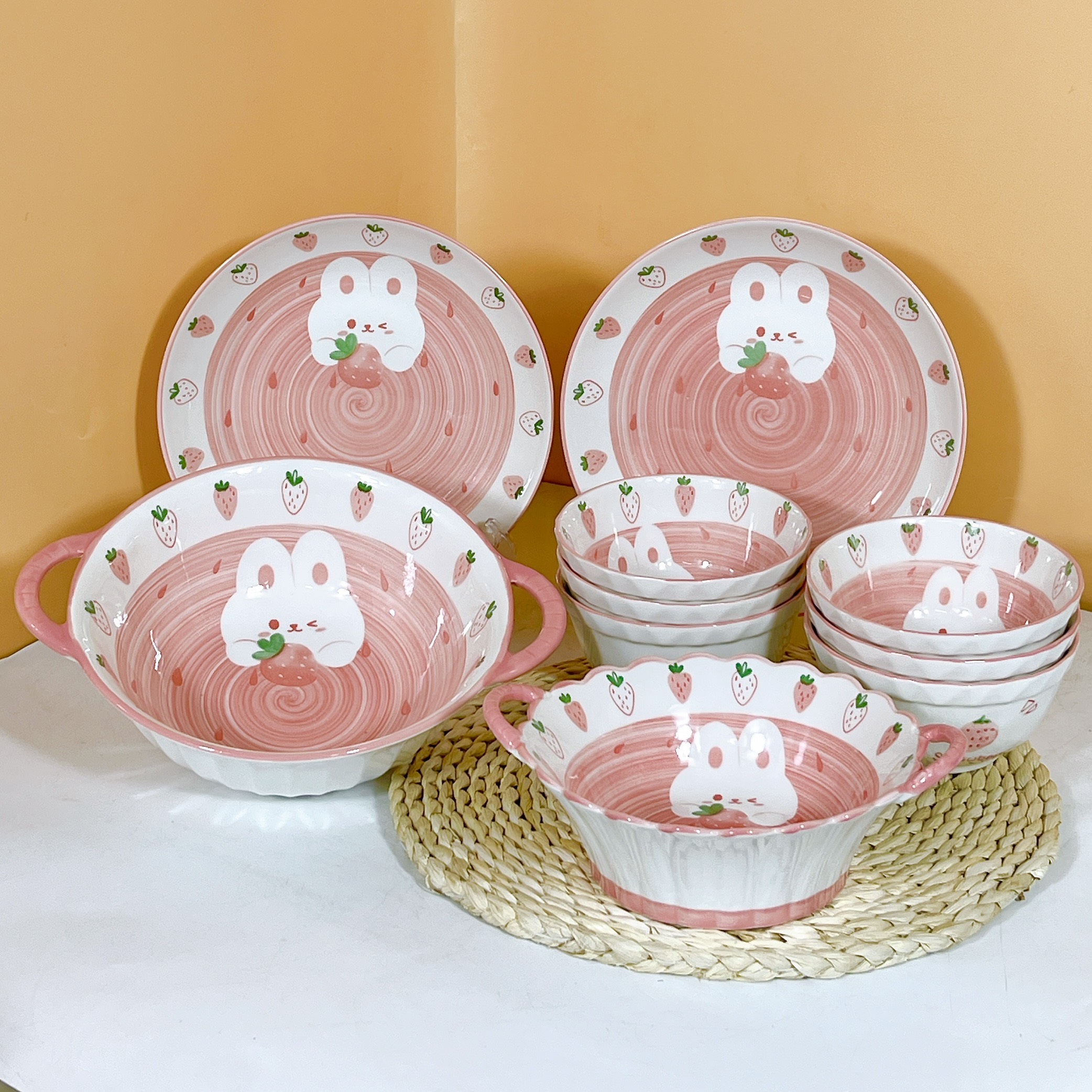 BỘ SẢN PHẨM CHÉN ĐĨA CAO CẤP THỎ HỒNG lấy cảm hứng từ phong cách hiện đại, trẻ trung phương Tây, Chất liệu gốm sứ tráng men cao cấp, không chứa chì, không độc hại, thân thiện với môi trường, kiểu dáng đa dạng, họa tiết sắc nét, màu sắc phù hợp với những gia đình yêu thích sự cổ điển, tinh tế. Sản phẩm sử dụng an toàn với lò vi sóng, lò nướng, máy rửa bát.