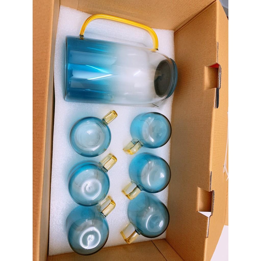 ✨Bộ bình kèm 6 cốc thủy tinh uống nước xanh dương