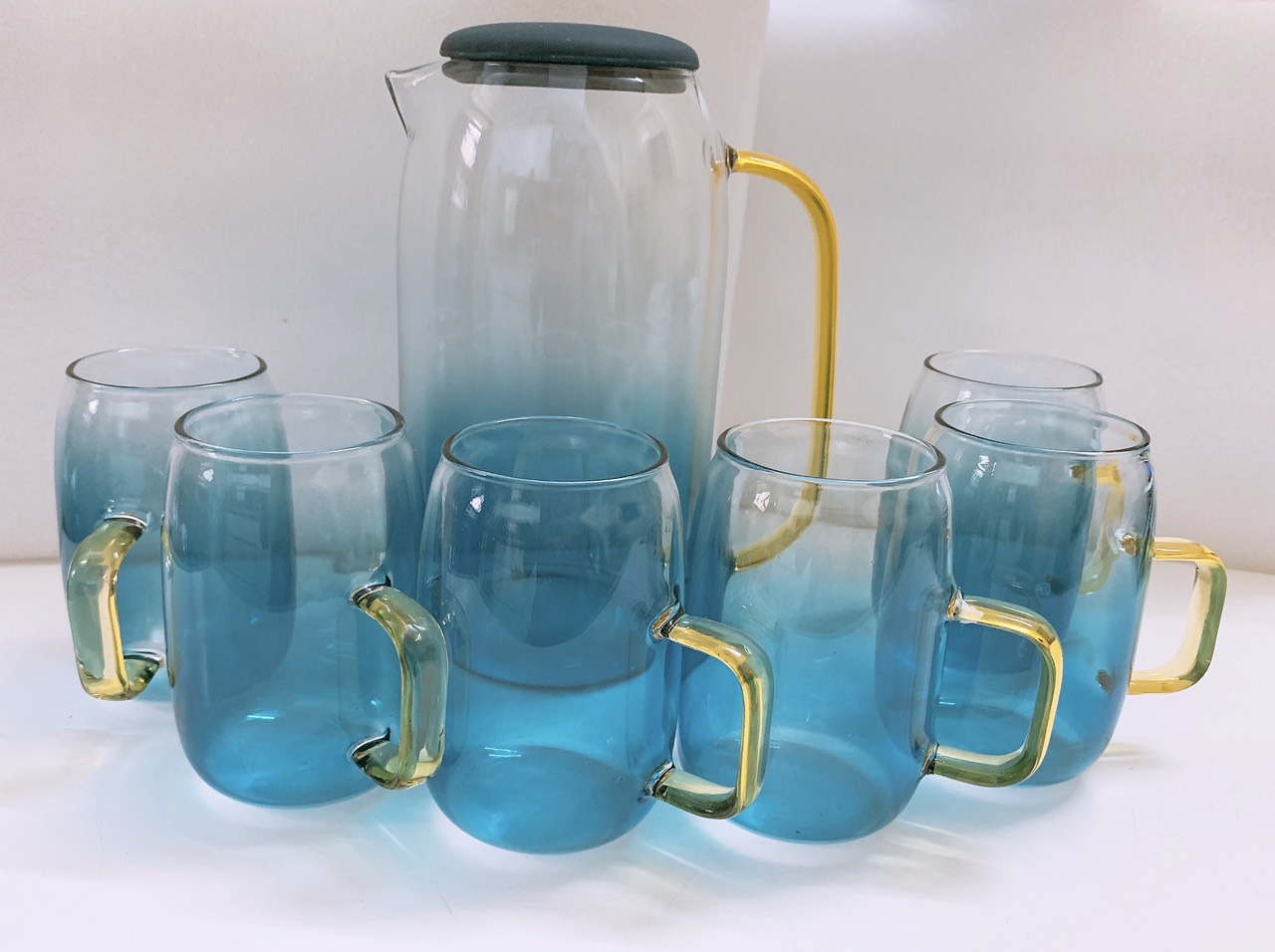 Bộ sp thủy tinh Vân nhân tay cầm màu vàng 1 bình thủy tinh 6 cốc coa tay cầm dễ sử dụng