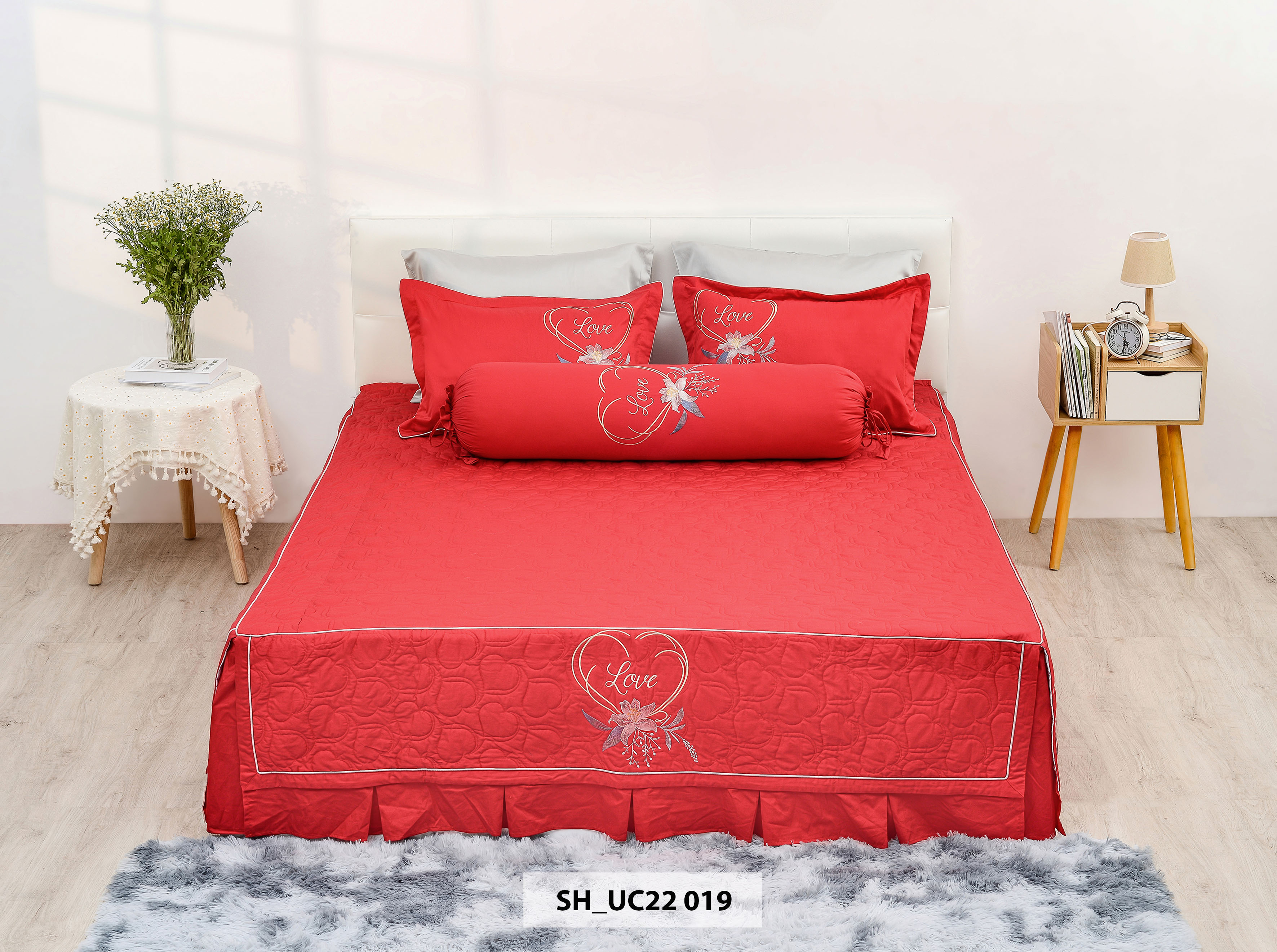 - Màu sắc:Tươi sáng,trẻ trung ,hiện đại được thiết kế với các họa tiết thêu tinh tế nhẹ nhàng và sang trọng. Bộ sản phẩm cao cấp Urban collection là làn gió mới cho căn phòng đầy yêu thương thoải mái hướng đến giấc ngủ xanh và hoàn hảo sau một ngày dài với công việc.Sự đa dạng về kiểu dáng, chất liệu, kích thước đến màu sắc mang lại nhiều lựa chọn cho gu thẩm mỹ của mỗi khách hàng.Với những cải tiến cập nhật và ứng dụng xu thế thiết kế mới nhất,không gian phòng ngủ của bạn không chỉ sang trọng ,đẳng cấp mà còn tràn ngập sự ấm áp yêu thương. UC22 019: Với chủ đích thiết kế cho các cặp tình nhân, bộ UC22 019 lấy gam màu đỏ là chủ đạo, nền tảng cảm hứng Romantic với dòng chữ thêu Love được bao bọc bởi hình trái tim, tạo cho bộ thiết kế thêm mềm mại. HƯỚNG DẪN SỬ DỤNG: