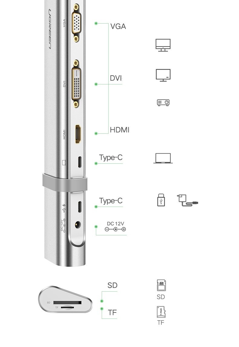 - Hub USB type-C chuyển đổi đa năng Ugreen 40373 chuyển đổi nhiều màn hình hỗ trợ USB 3.0 hub + Thẻ SD / TF đọc + Gigabit Lan + Audio (mic + tai nghe) + VGA + HDMI + DVI.
