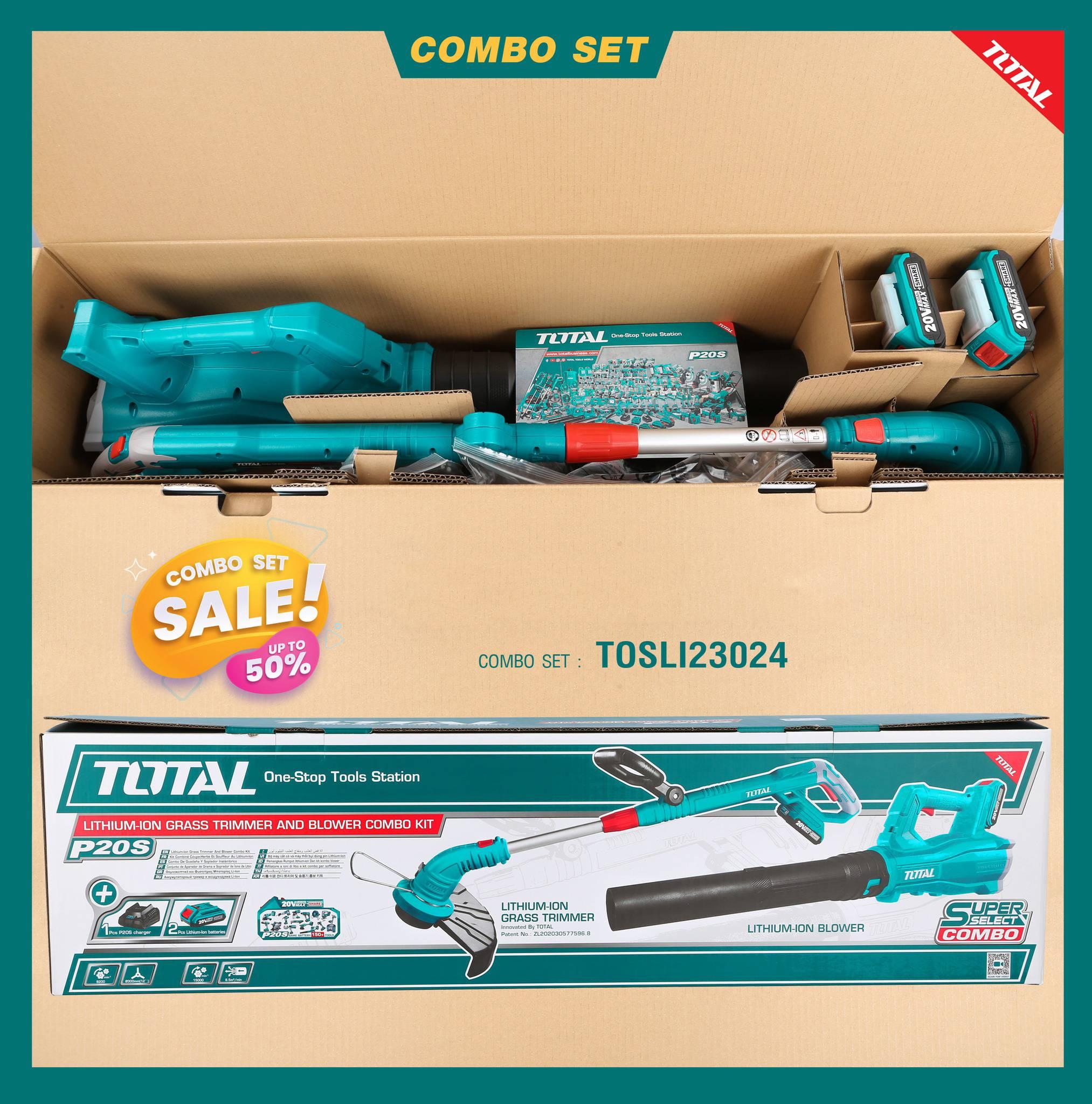Bộ combo TOTAL TOSLI23024 gồm máy cắt cỏ TGTLI20018 và máy thổi bụi dùng pin 20V TABLI20323, là sự lựa chọn hoàn hảo cho công việc làm vườn của bạn. Với hiệu suất cao, tính năng tiện ích và độ bền vượt trội, bộ combo này sẽ giúp bạn tiết kiệm thời gian và nỗ lực trong việc chăm sóc khuôn viên xanh của gia đình.
