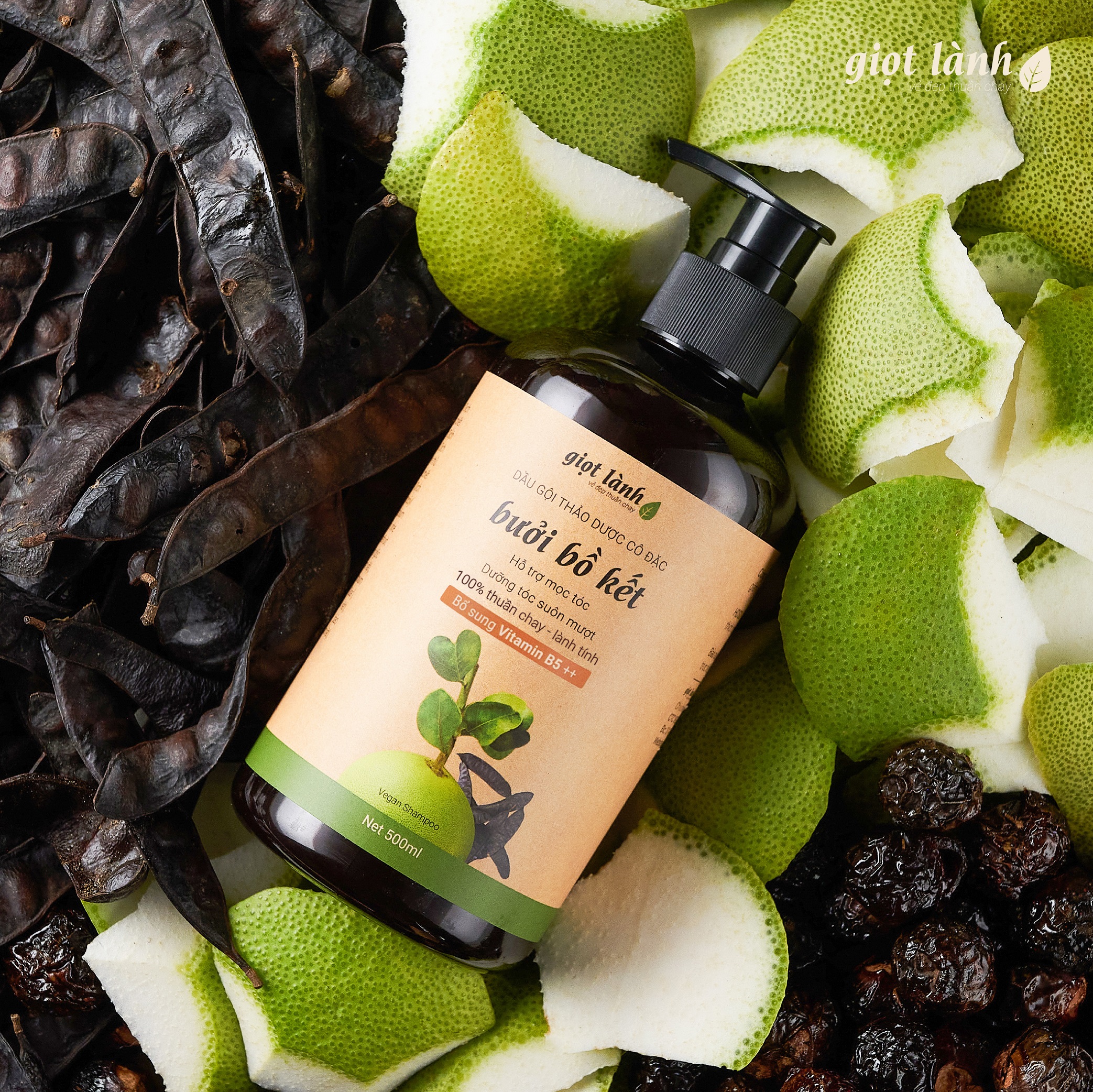 Dầu gội bồ kết, dầu gội bưởi Giọt Lành thuộc dòng dầu gội thảo dược thiên nhiên với nguyên liệu thuần chay. Dầu gội Giọt Lành sử dụng cao đun cô đặc từ nhiều loại thảo dược như bồ kết, bồ hòn, hà thủ ô, mần trầu, vỏ bưởi, bạc hà,... giúp chất dầu gội có màu nâu đen tự nhiên, và hương thơm dịu nhẹ từ thảo dược hòa quyện tạo thành.   Xịt tóc Giọt Lành được kết hợp giữa tinh dầu bưởi đậm đặc, cùng tinh dầu hương nhu, sả chanh và Vitamin B7, Biotin giúp hỗ trợ kích mọc nhanh, giảm rụng mà hoàn toàn không gây bết dính tóc sau khi dùng.