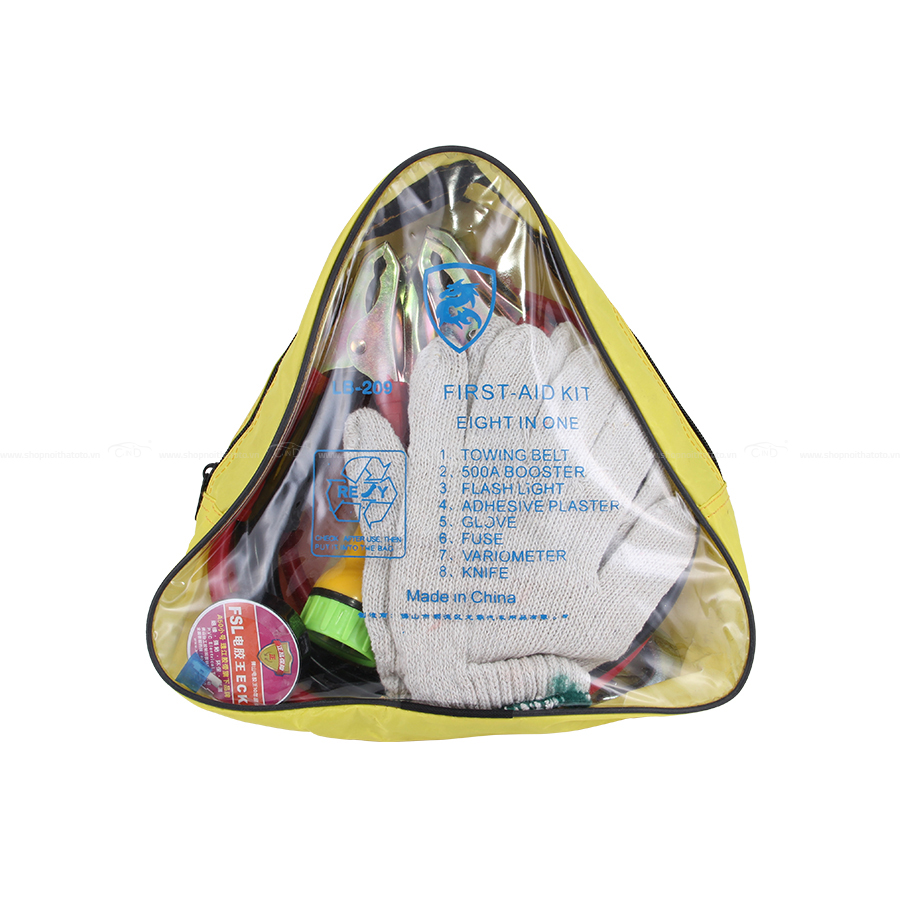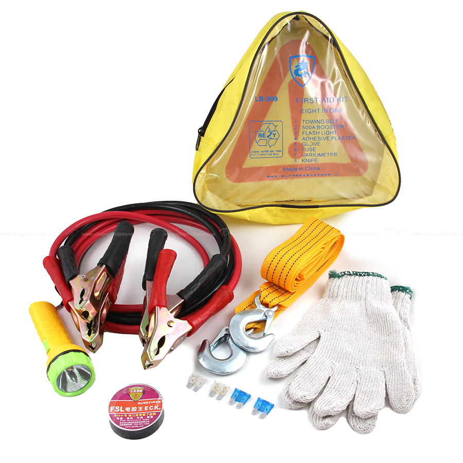 • Gồm 5 sản phẩm bên trong: dây sạt bình 500A, dây kéo xe, cầu chì, bao tay, đèn pin.