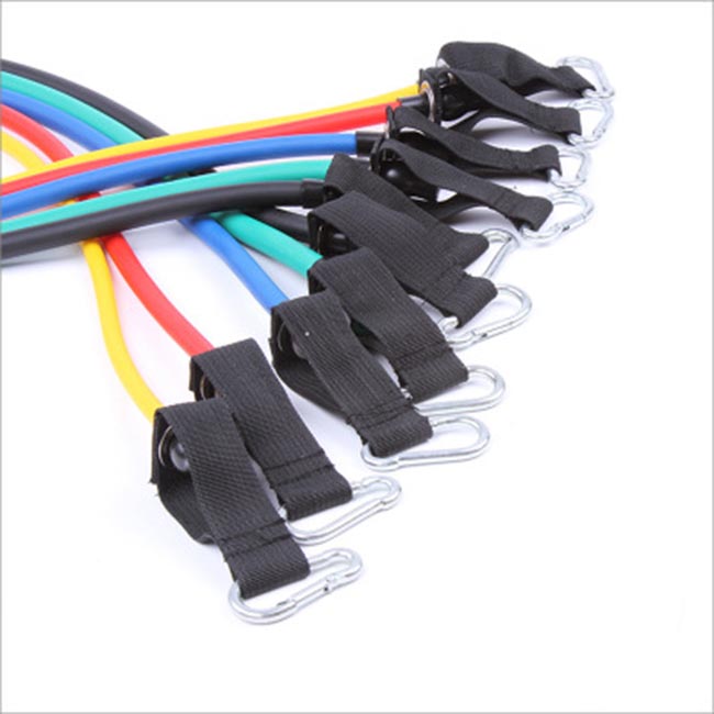 Bộ dây đàn hồi tập thể lực có 5 dây, mỗi dây có mức trọng lượng khác nhau, từ nhẹ tới nặng (8 lbs, 15 lbs, 20 lbs, 25 lbs, 30 lbs) có thể