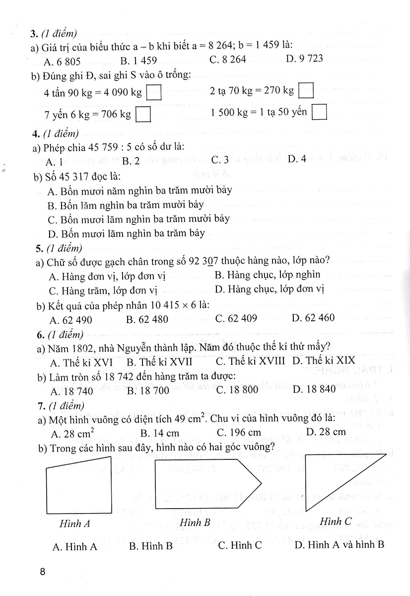 Từ năm học 2023 – 2024, các em học sinh lớp 4 được học sách giáo khoa theo Chương trình giáo dục phổ thông mới. Mục tiêu của chương trình mới là phát triển năng lực, phẩm chất của học sinh. Nhằm hỗ trợ quý thầy cô và các bậc phụ huynh có thêm tài liệu hướng dẫn các em học sinh học tốt môn Toán lớp 4, giúp các em thi giữa học kì và cuối học kì I đạt kết quả cao, chúng tôi tổ chức biên soạn cuốn sách: BỘ ĐỀ KIỂM TRA MÔN TOÁN LỚP 4 - TẬP 1.