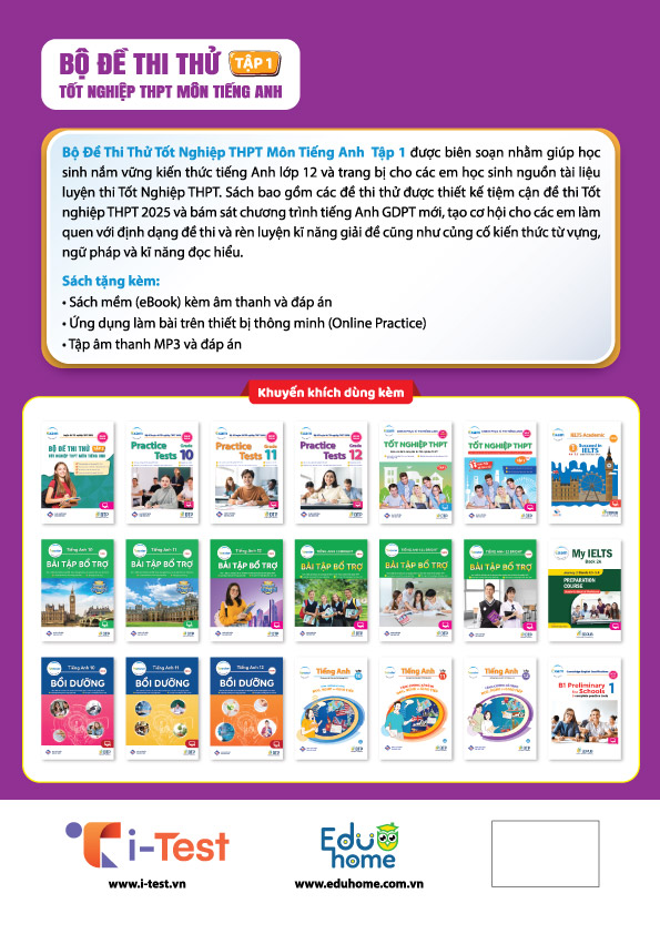 Bộ đề thi thử Tốt nghiệp THPT môn tiếng Anh 2025 Đặc điểm nổi bật: * Trọn bộ 28 đề thi thử Tốt nghiệp THPT 2025 (Gồm 2 cuốn: tập 1 & 2) * Viết
