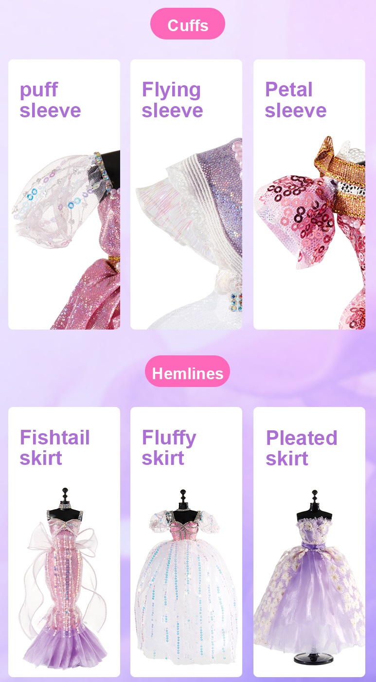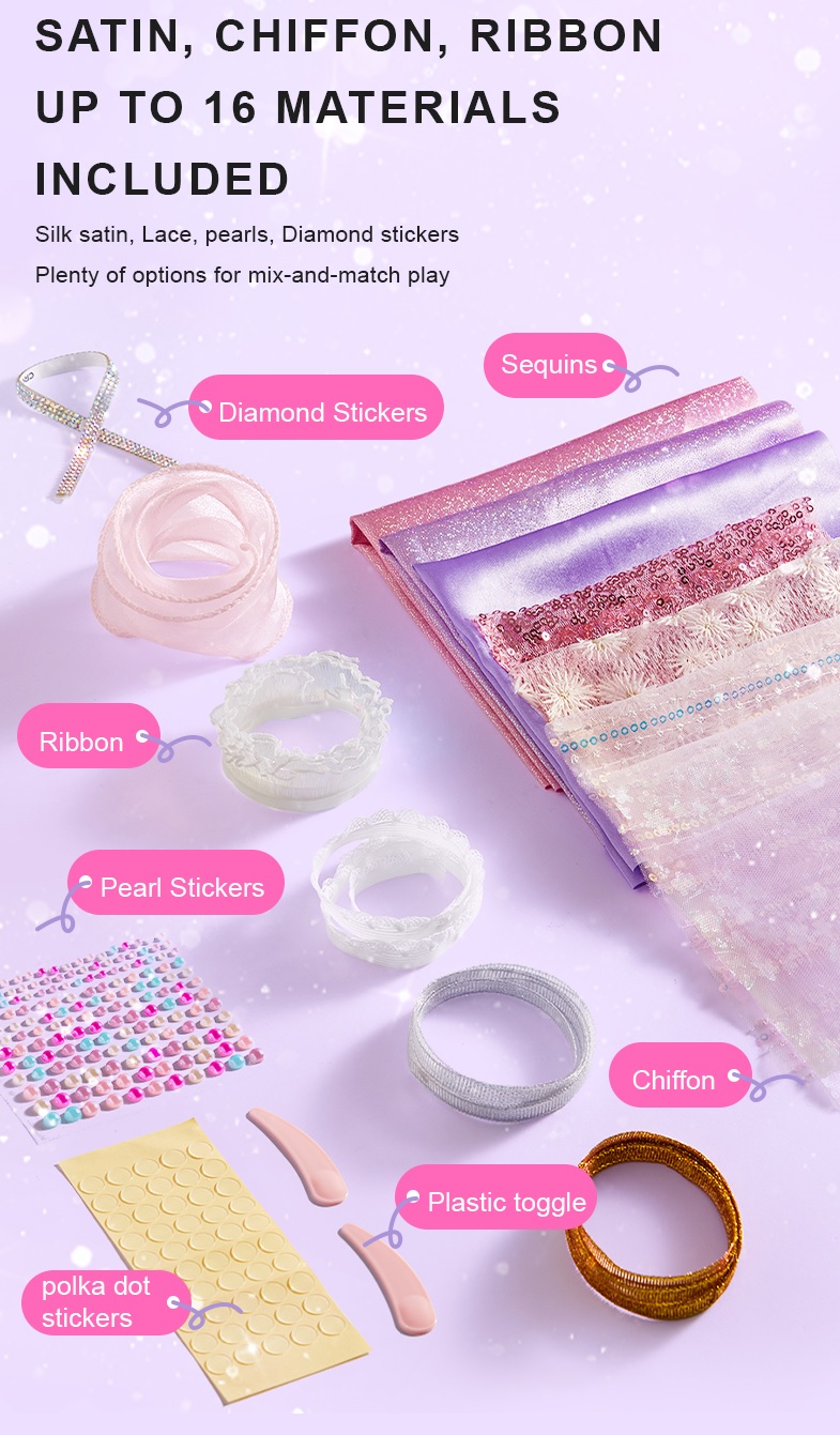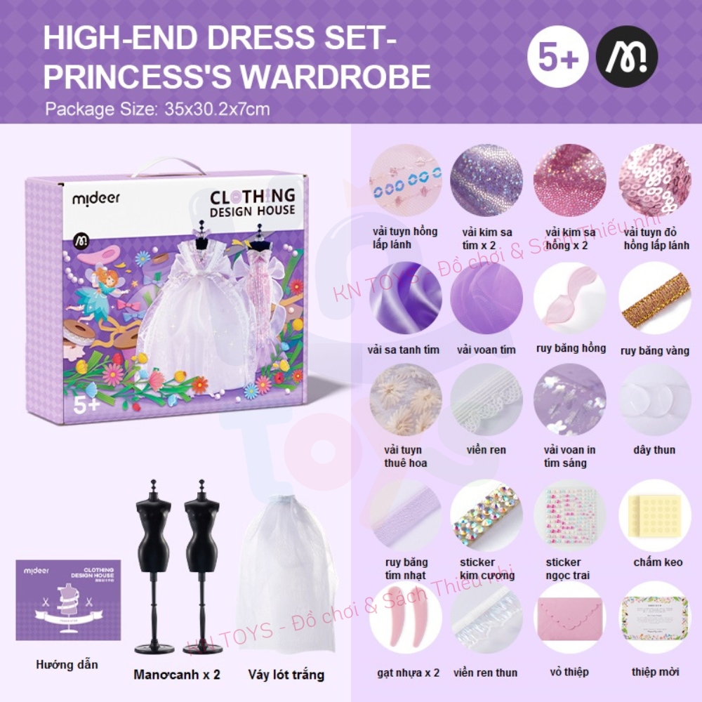 - Ruy băng - viền ren các lại Với hướng dẫn rất cụ thể, chi tiết trong bộ sản phẩm, bé có thể thực hành làm một chiếc váy đuôi cá cực xinh luôn cả nhà ạ Bước 1: Đặt vải ôm sát thân ma nơ canh. Nhét phần vải dư vào giữa lưng ma nơ canh Bước 2: Tiếp tục sử dụng vải tuyn hồng làm lớp váy lót và nhét phần vải dư vào giữa lưng ma nơ canh Bước 3: Thiết kế nơ bằng vải ruy băng và sticker kim cương. Dán nơ phần trước ngực bằng chấm keo Bước 4: Tiếp tục thiết kế phụ kiện như vòng cổ, thắt lưng bằng sticker kim cương hoặc các phụ kiện khác theo sự sáng tạo của bé. Khi bé hoàn thành các thiết kế, bố mẹ đừng ngại ngần trao giải nhà thiết kế cao cấp cho bé thêm yêu thích Trong bộ đồ chơi còn có sẵn 1 showroom trưng bày nho nhỏ - mang đến ngạc nhiên cho bé - bé thật sự nhập vai với việc mình được trở thành 1 nhà thiết kế thời trang chuyên nghiệp - khơi gợi đam mê và thành công cho bé sau này