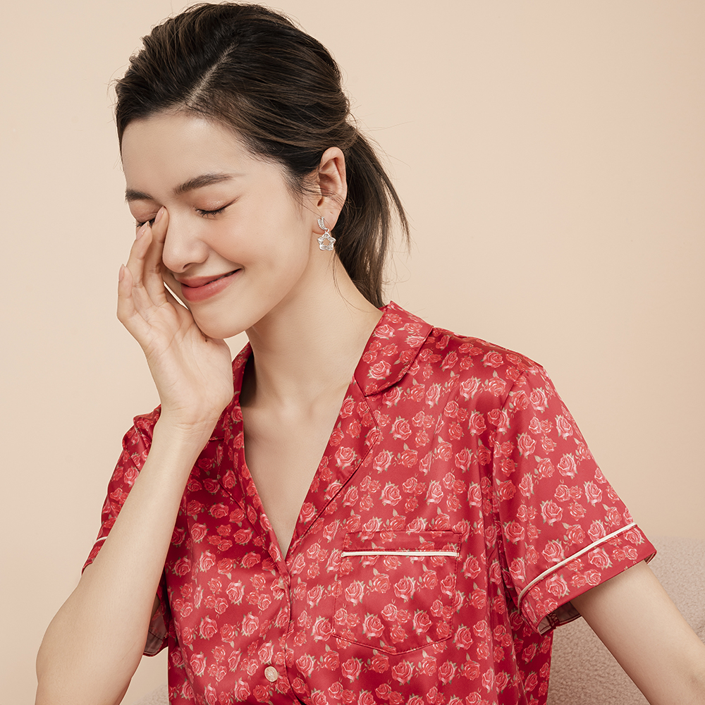 Đặc điểm nổi bật: - Bộ short satin màu hồng - tay ngắn + cổ dalton + đắp túi ngực + phối dây ruband - đô thân sau - Chất liệu satin - Dáng bộ