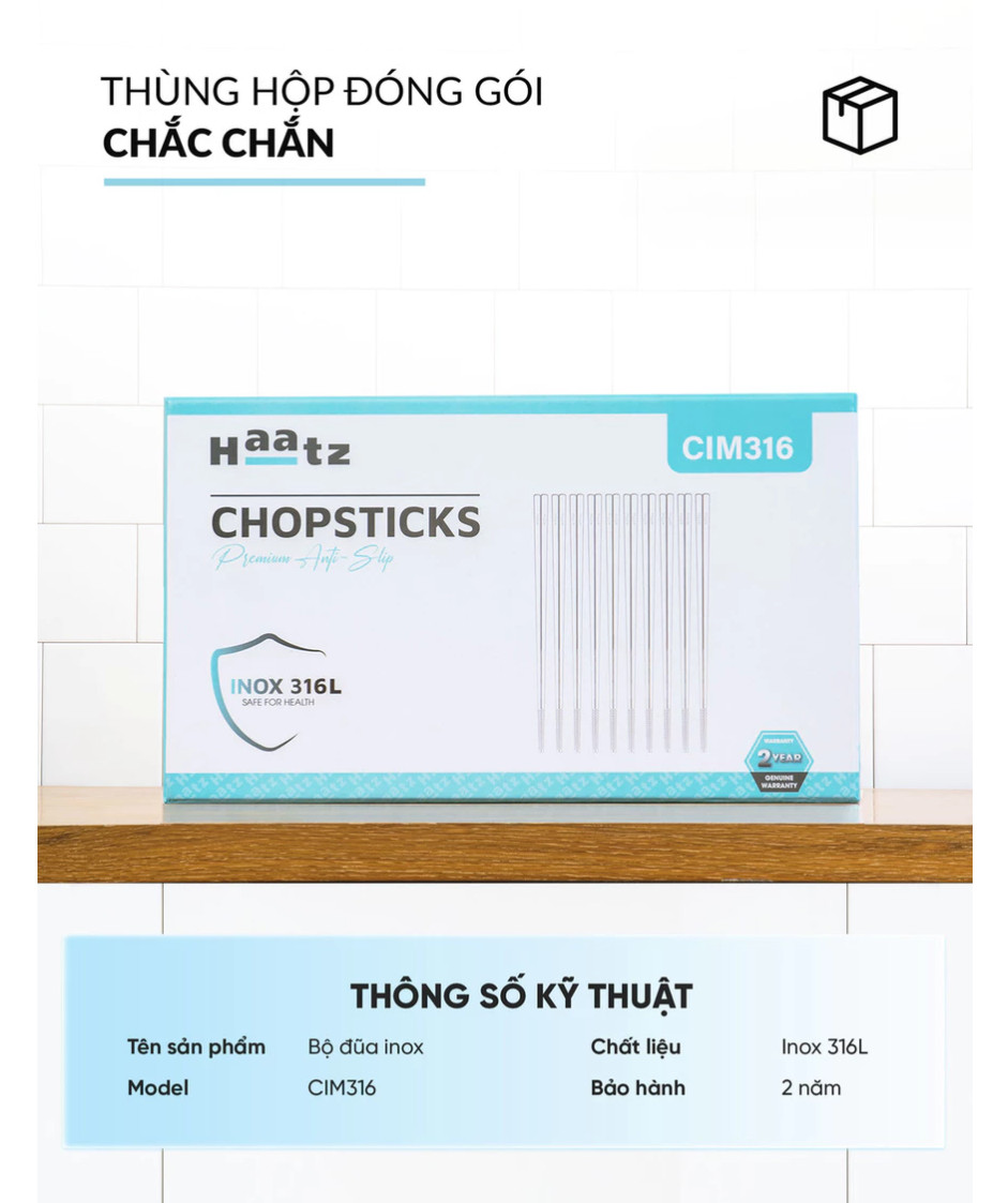 Trong khi các loại đũa gỗ hay nhựa dễ bị mòn, ố màu và không đảm bảo an toàn vệ sinh, CIM316 mang đến giải pháp tối ưu với độ bền vượt trội và khả năng bảo vệ sức khỏe. Đầu tư một bộ đũa inox CIM316 HAATZ chính là đầu tư cho sự an tâm và chất lượng sống của gia đình bạn.