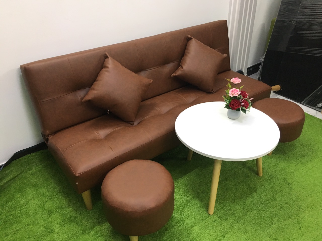 Mua tại TiktokSofa bed, sofa giường 1m7x90, có thể bật ra thành giường để nằm Kích thước 1m7x90 (kích thước phổ thông) Chất liệu: khung gỗ dầu, mút d30, simili Bao gồm: ghế dài 1m7x90, 2 gối ôm, 2 ghế đôn tròn, bàn tròn đường kính 60x45 The sofa can be unfold to be bed Size: 170cm x 90 including sofa bed, 2 cushions, 2 ottomans and white table