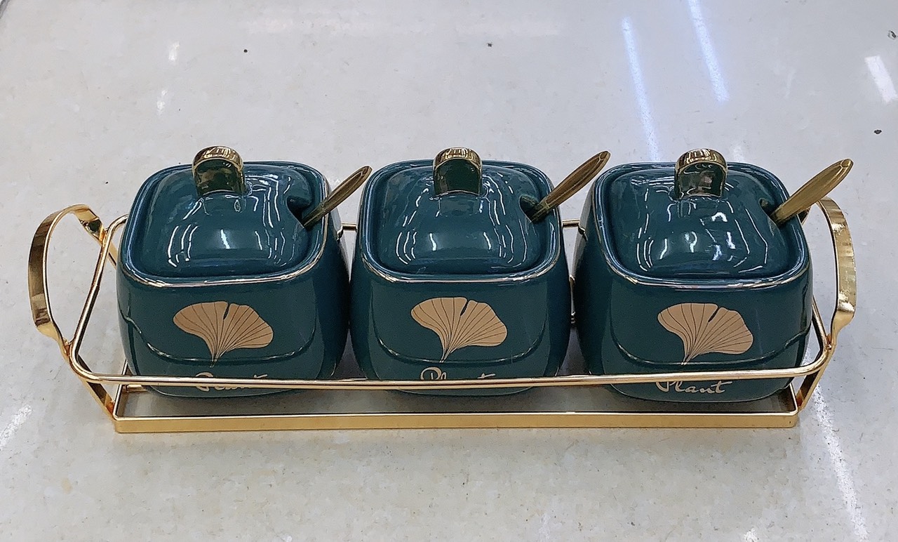 ✨BỘ GIA VỊ SỨ CAO CẤP MÀU XANH CỔ VỊT KHUNG KIM LOẠI MẠ VÀNG