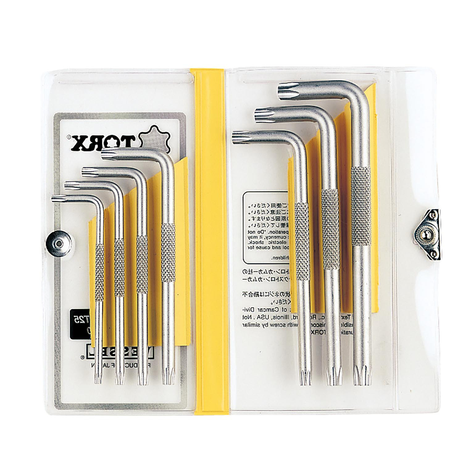 Đặc điểm nổi bật của bộ hoa khế No.8507 TX - Vật liệu thép Crom Vanadi có độ cứng cao. Không có từ tính. - Đầu vặn vít được mạ màu vàng Sâm Panh có độ
