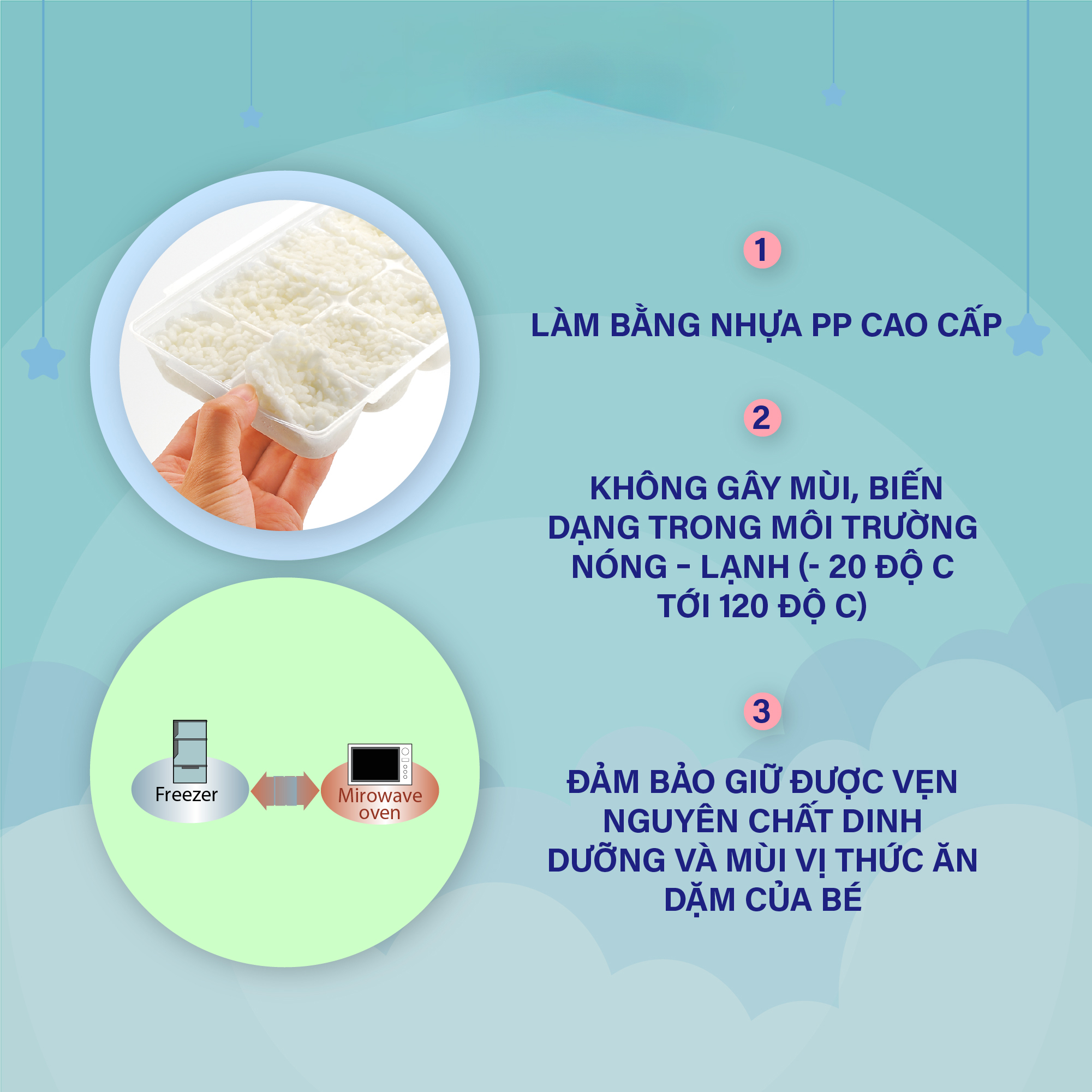 - Mỗi khay trữ đông Richell chia làm 8 ngăn nhỏ sâu lòng, đi kèm nắp đậy kín đảm bảo vệ sinh tối đa. Sản phẩm rất thích hợp để mẹ cất trữ khẩu phần riêng biệt cho con theo từng bữa (đặc biệt với các mẹ theo phương pháp ăn dặm kiểu Nhật).