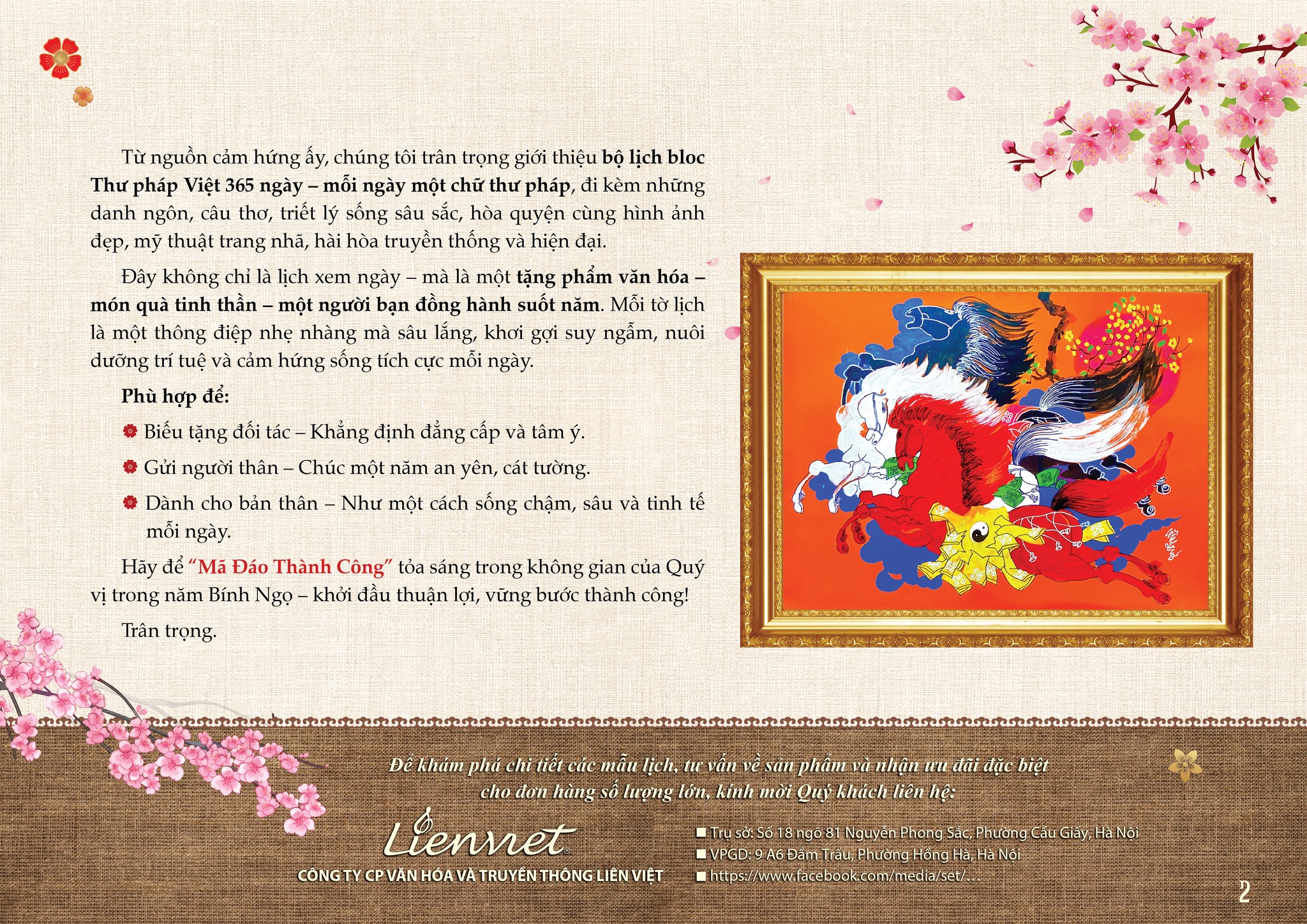 Kính gửi Quý khách hàng, Trong không khí hân hoan đón chào Xuân Bính Ngọ 2026 – năm của sức sống mãnh liệt và khát vọng bứt phá, chúng tôi trân trọng giới thiệu bộ Lịch Tết nghệ thuật Thư pháp Việt mang chủ đề “Mã Đáo Thành Công”. Điểm nhấn đặc biệt của bộ lịch chính là hình tượng Tam Mã, lấy nguyên tác từ tranh vẽ của họa sĩ Lê Trí Dũng, người được mệnh danh là “một trong những họa sĩ đương đại vẽ ngựa đẹp nhất Việt Nam”. Tranh của ông không chỉ là hiện vẻ đẹp uy dũng, khí chất tự do của loài tuấn mã, mà còn gửi gắm tinh thần Việt Nam – mạnh mẽ, bền bỉ, quyết chí vươn lên. Trong mỹ thuật Á Đông, hình ảnh ba con ngựa cùng phi nước đại mang trong mình nhiều tầng ý nghĩa: Sức mạnh & Khí thế, Đoàn kết & Đồng lòng, Khát vọng & Thành công, Phong thủy cát tường Từ nguồn cảm hứng ấy, chúng tôi trân trọng giới thiệu bộ lịch bloc Thư pháp Việt 365 ngày – mỗi ngày một chữ thư pháp, đi kèm những danh ngôn, câu thơ, triết lý sống sâu sắc, hòa quyện cùng hình ảnh đẹp, mỹ thuật trang nhã, hài hòa truyền thống và hiện đại. Đây không chỉ là lịch xem ngày – mà là một tặng phẩm văn hóa – món quà tinh thần – một người bạn đồng hành suốt năm. Mỗi tờ lịch là một thông điệp nhẹ nhàng mà sâu lắng, khơi gợi suy ngẫm, nuôi dưỡng trí tuệ và cảm hứng sống tích cực mỗi ngày. Hãy để “Mã Đáo Thành Công” tỏa sáng trong không gian của Quý vị trong năm Bính Ngọ – khởi đầu thuận lợi, vững bước thành công!