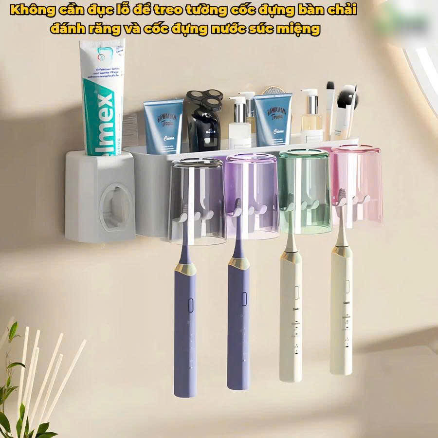 ✨Bộ Nhả Kem Đánh Răng Tự Động – Kệ Bàn Chải Dán Tường, 4 Cốc Tiện Lợi Cho Gia Đình