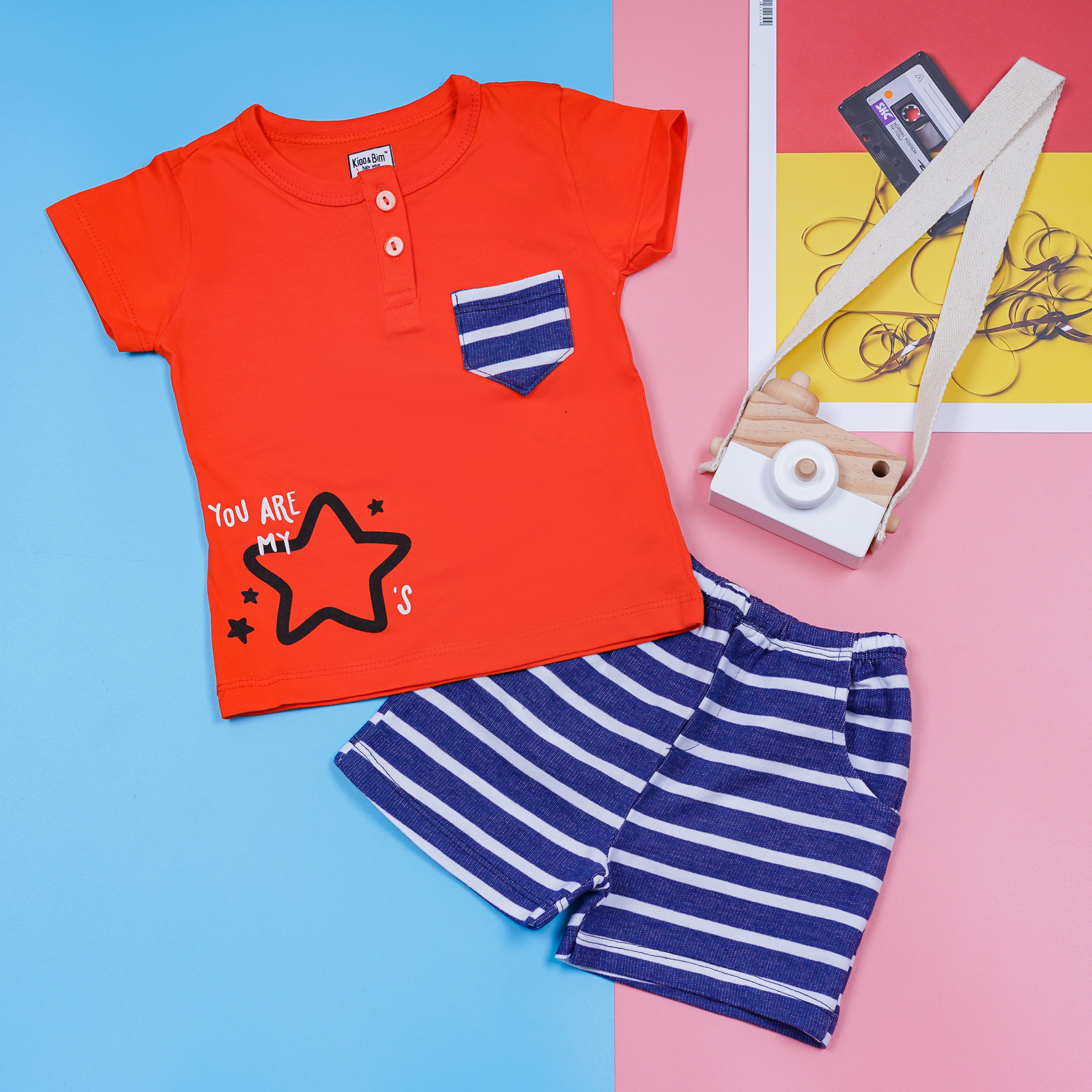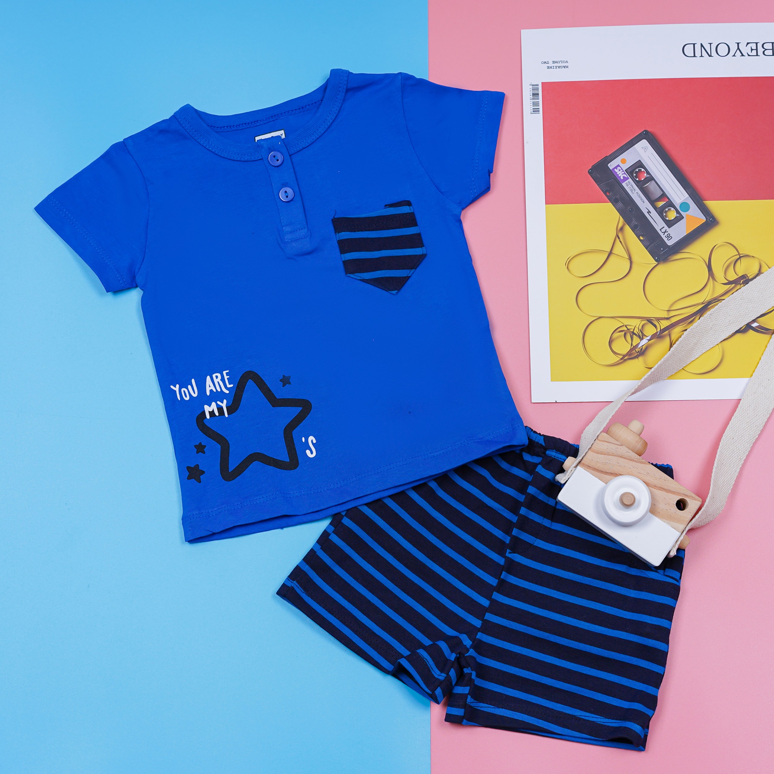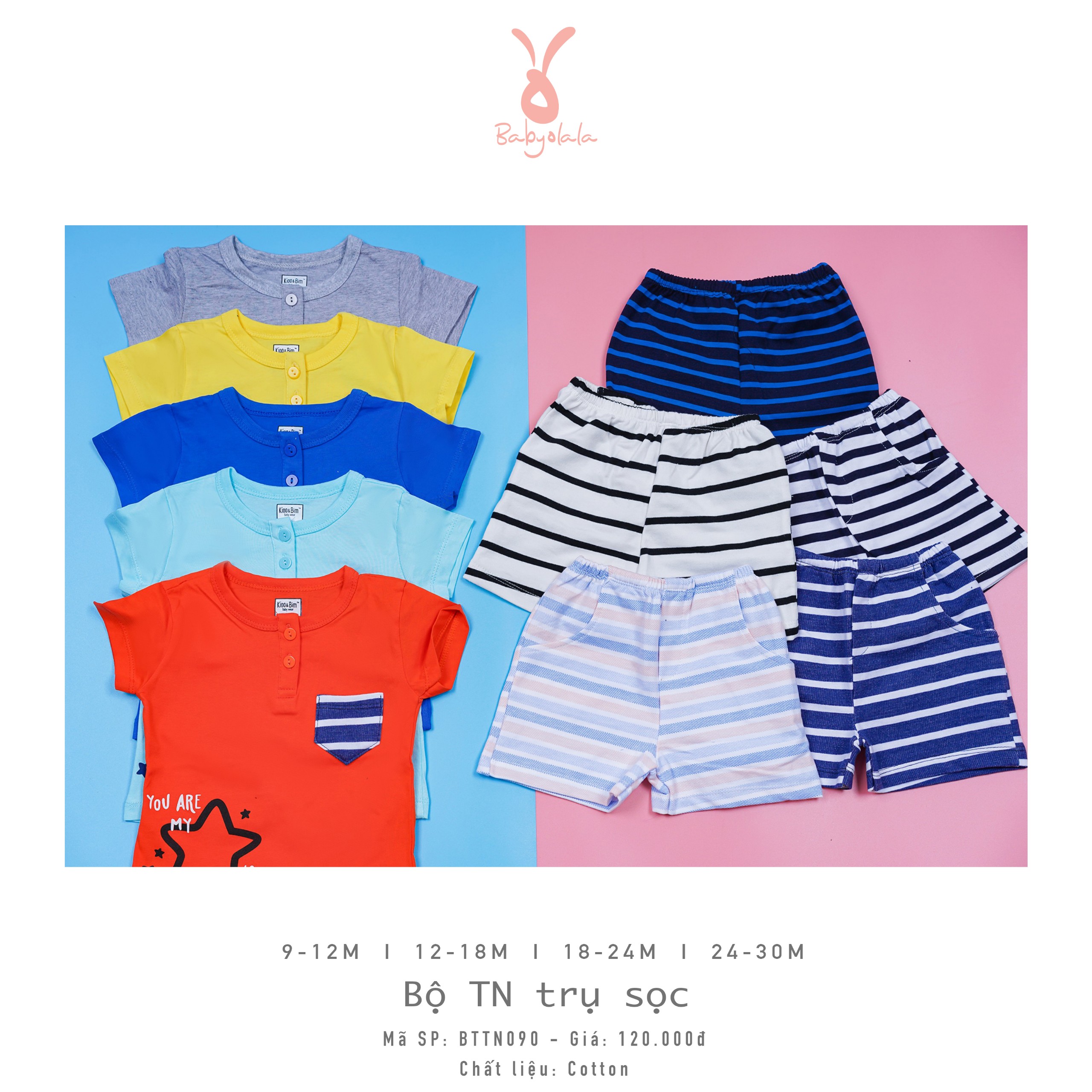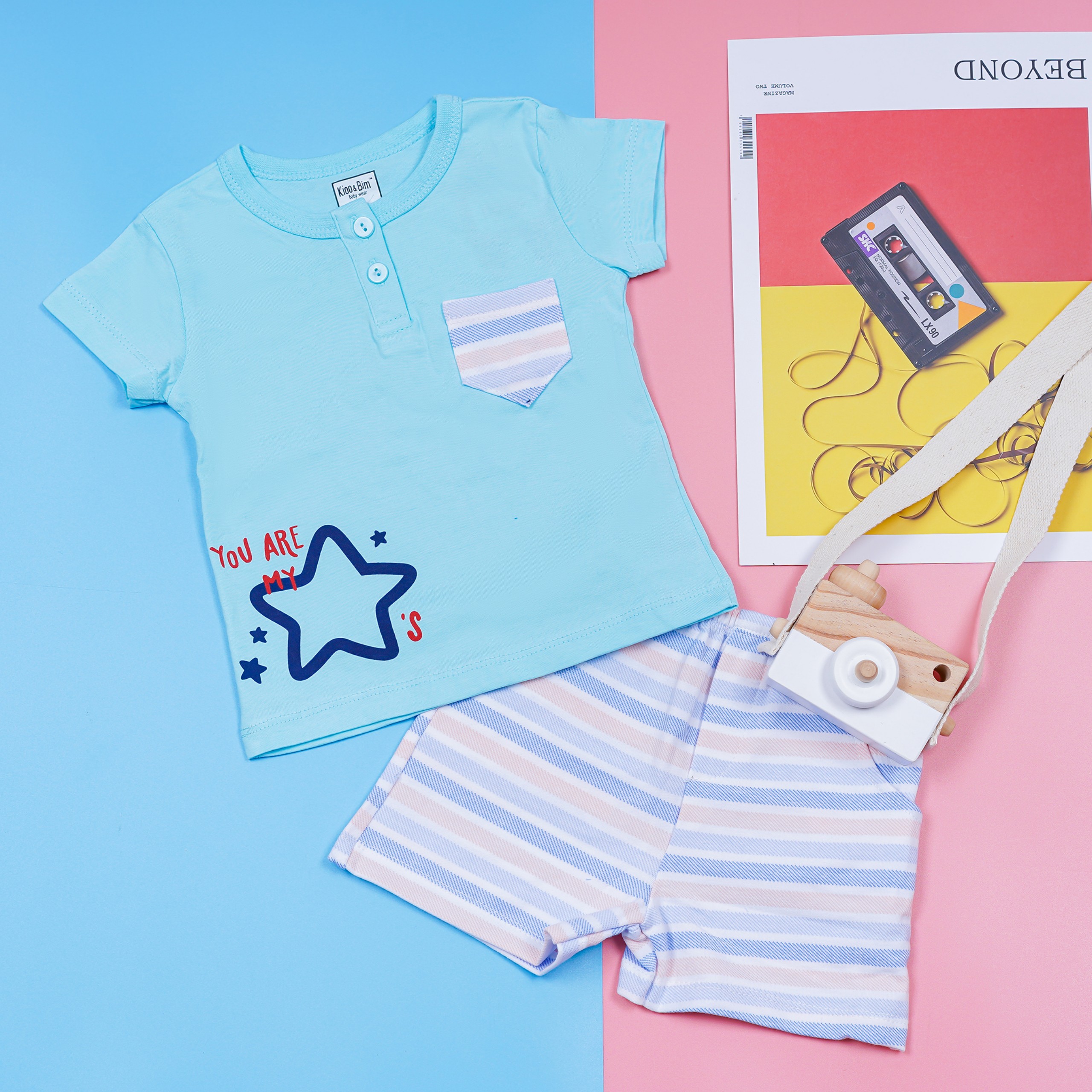✨Bộ quần áo cổ trụ in sọc tay ngắn chất cotton mềm thoáng mát cho bé trai từ 3-12kg Kioo BT090