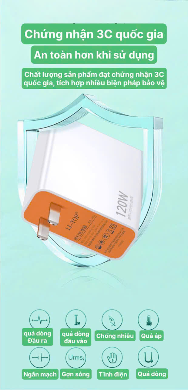Bộ sạc nhanh 120W LI-TOP T12 3in1 (Type C, L, V8), đạt chứng nhận 3C tiêu chuẩn quốc gia, bảo hành 12 tháng