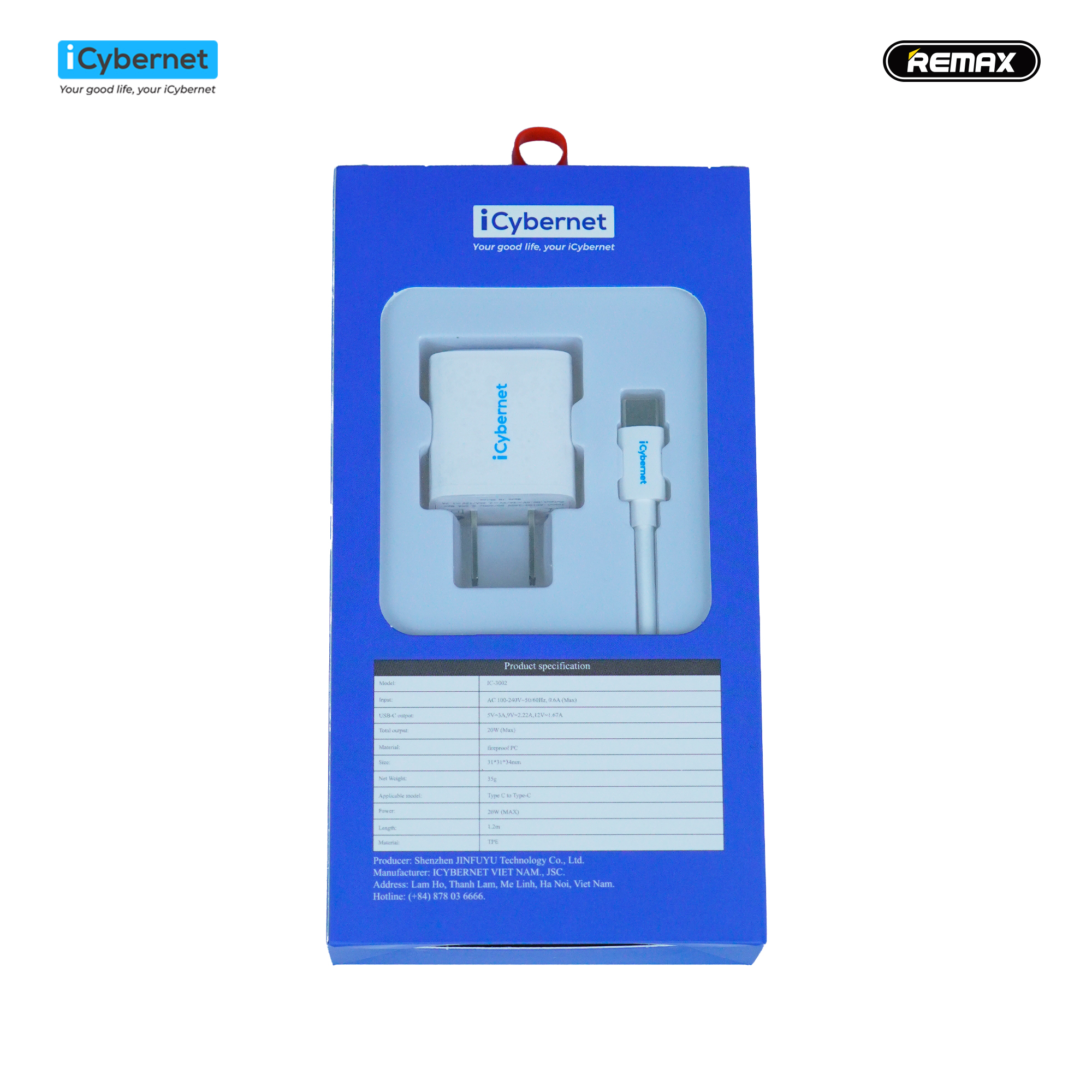 ✨Bộ sạc nhanh chuẩn PD 20W iCybernet IC-3002 cáp C to C 1,2m (Cáp hỗ trợ sạc tối đa 100W cho mọi thiết bị typeC) - Hàng chính hãng