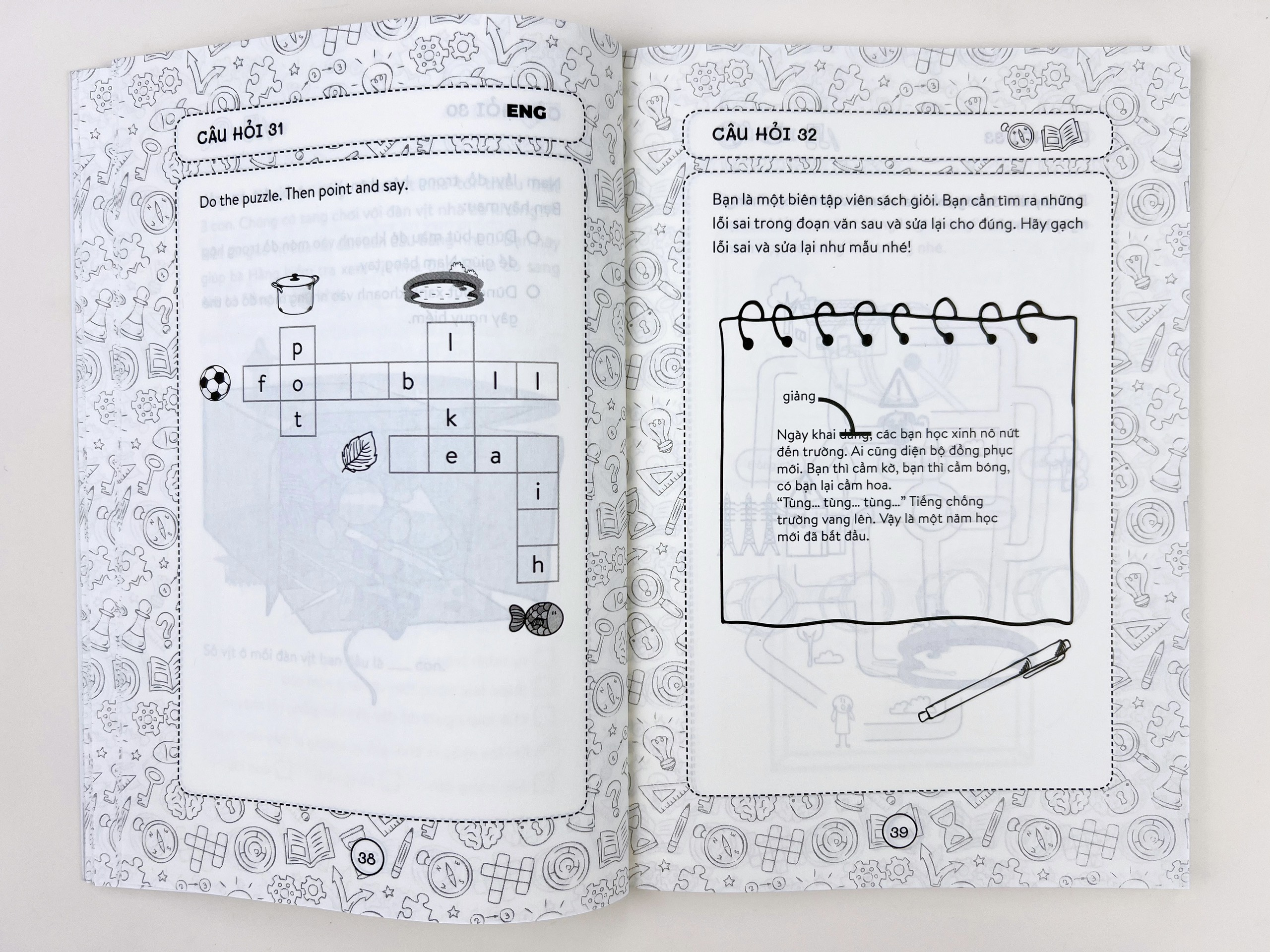 Những câu hỏi biên soạn giúp trẻ hình thành tư duy tổng hợp và phát triển toàn diện những tri thức đã học. Đồng thời, với thiết kế sáng tạo và khoa học, lồng ghép dưới dạng các trò chơi trí tuệ như: dò m ì n, nối số, xây tháp, hỏi đáp thông trẻ vui thích chơi cùng cuốn sách, cùng những tri thức xuất hiện vừa quen thuộc vừa mới lạ.
