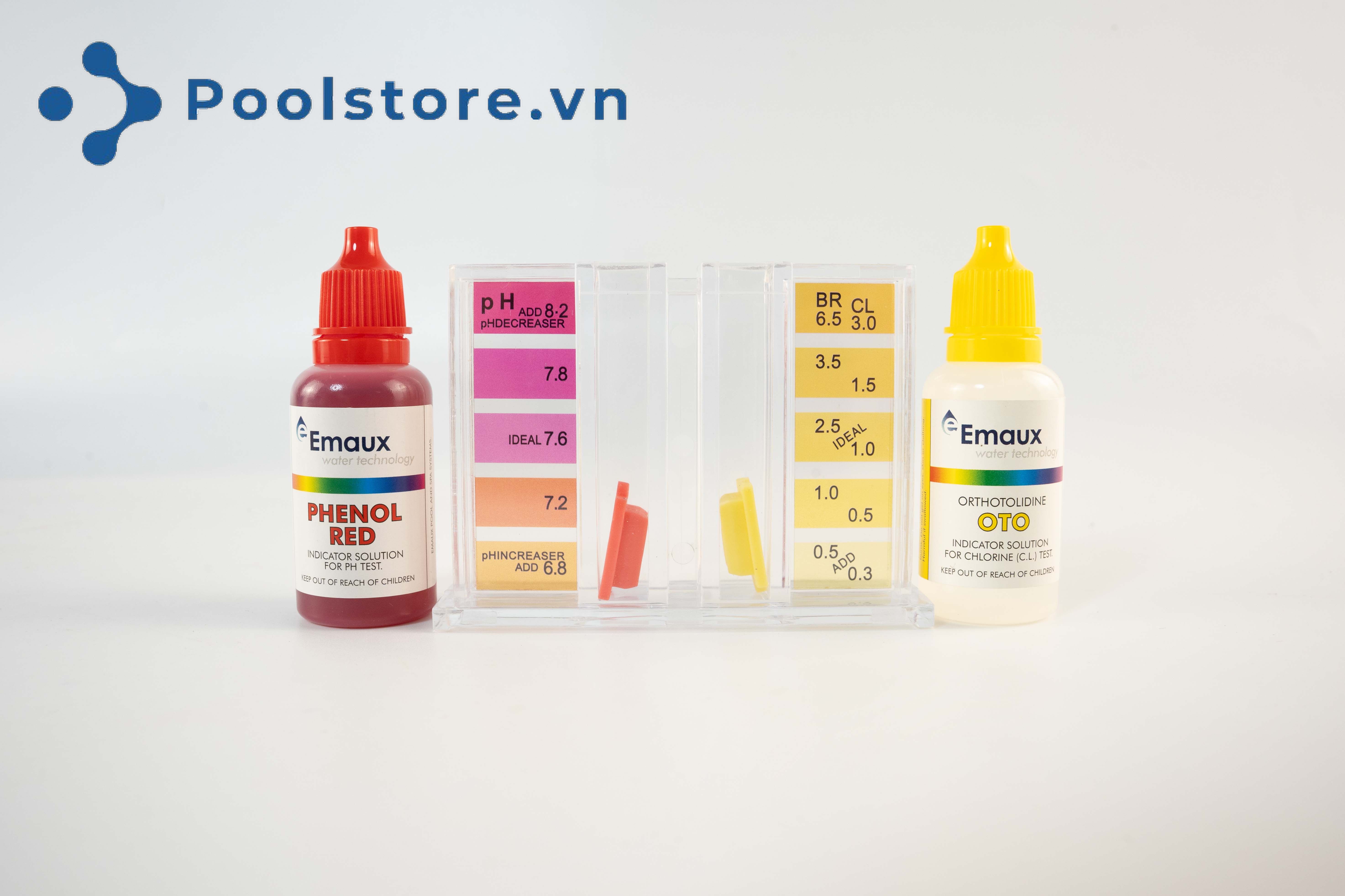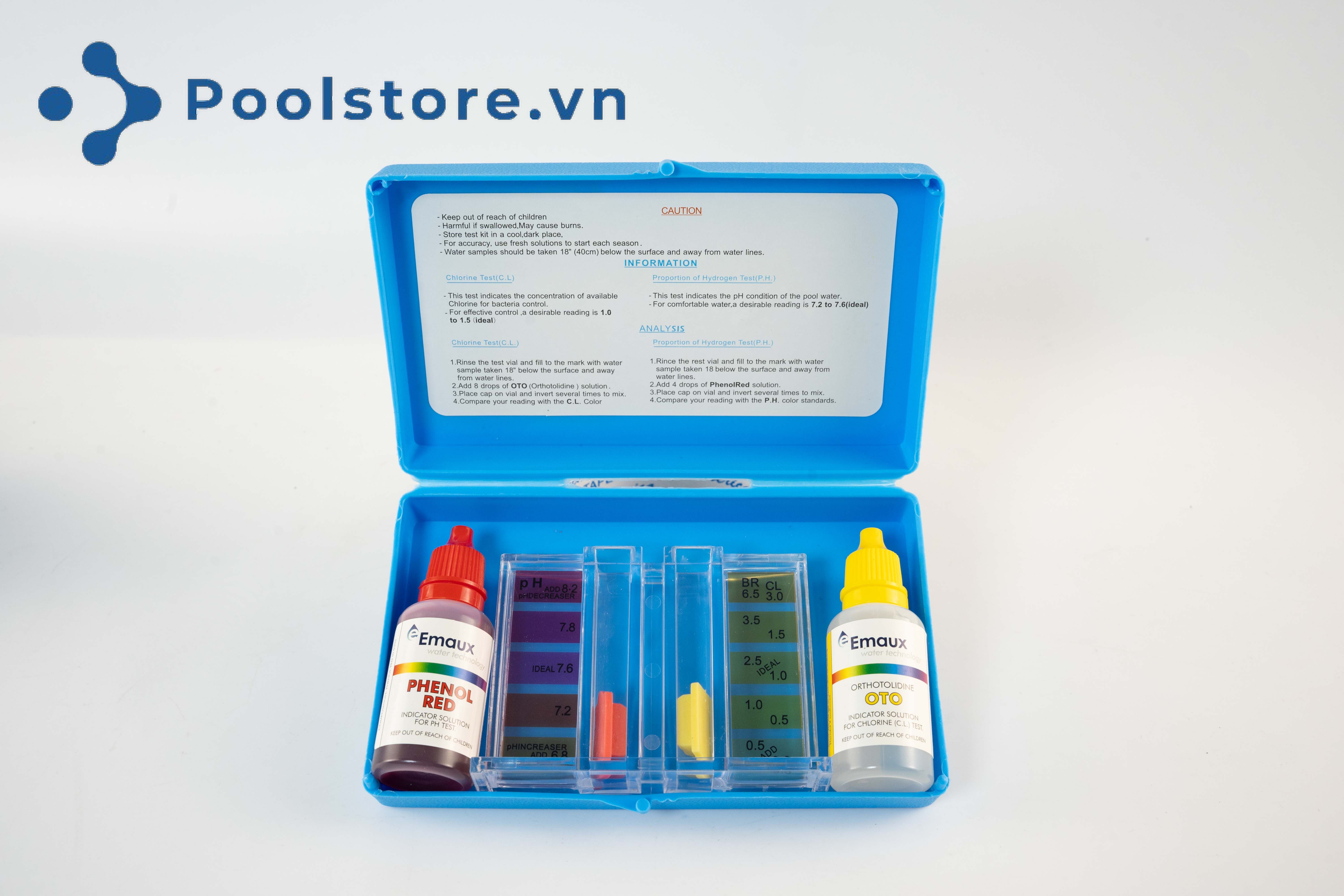 THÔNG SỐ KỸ THUẬT – Tên sản phẩm: Bộ test nước hồ bơi Emaux – Xuất xứ: China – Khối lượng: 0.076 kg – Lọ hóa chất OTO: 15ml, 0.024 kg – Lọ hóa chất