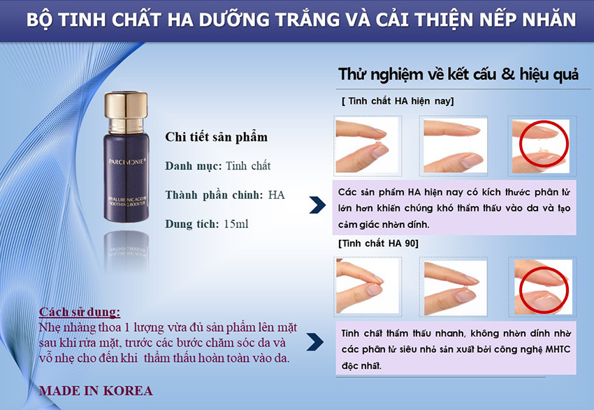 Với Parcimonie Hyaluronic Acid 90 Soothing Booster có tác dụng hiệu quả trong việc dưỡng trắng da an toàn và phù hợp với mọi loại da đồng thời nuôi dưỡng làn da khỏe mạnh, tăng độ đàn hồi và giúp da tràn đầy sức sống và cải thiện nhanh chống tình trạng khô da.