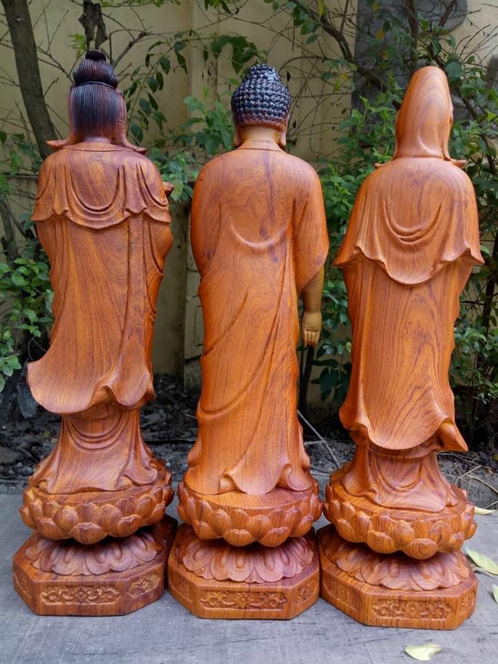 Bộ tượng phật tam thánh được làm bằng chất liệu gỗ hương đá liền khối khối tự nhiên 100%  Kích thước cao 40×12×12cm _ Bộ tượng phật tam thánh được trạm khắc tỉ mỉ ,Tinh sảo kỳ công .Đi hầu hết tất cả mọi chi tiết góc ngách nội dung hoa văn của bộ tam thánh .Đều được ngọt tỉa ,Chỉnh sửa hoàn toàn bằng tay thủ công .Đồng thời tượng được kiểm định kỹ lưỡng như cho vào thẩm sấy cho gỗ khô kiệt .Mục đích trống dập nứt vênh mo mối mọt .Kết hợp với trà nhám ,đánh giấy giáp nhiều nước ,Sờ mát lạnh rồi cho vào phun lót làm bóng mờ để giữ lại mầu sắc vân gỗ tự nhiên ,Bộ tam thánh được làm và hoàn thiện do bàn tay khối óc tài hoa ,Từ những người thợ giàu kinh nghiệm ,Cũng như tay nghề cao trong làng nghề truyền thống .Chính vì thế bộ tượng phật tam thánh đã đáp ứng đầy đủ những tiêu trí ( Đẹp bền rẻ ) Thẩm mỹ nghệ thuật với chất lượng tuyệt vời