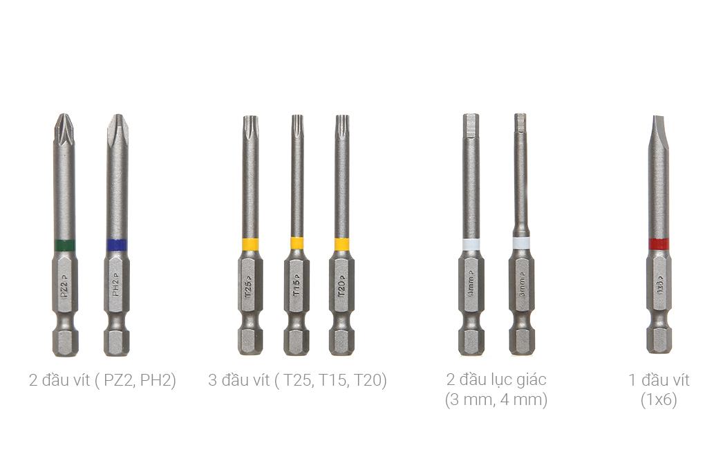 • Tổng chiều dài của đầu tuốc nơ vít: 65mm PH2 × 1 PZ2 × 1 S6 × 1 H3 × 1 H4 × 1 T15 × 1 T20 × 1 T25 × 1