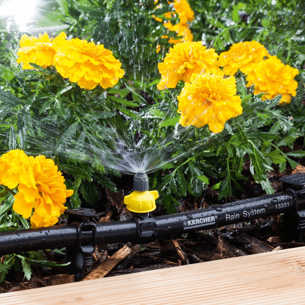 - Việc căn chỉnh góc phun có thể được điều chỉnh theo chiều ngang và chiều dọc nhờ đầu xoay. Trên vòi có thể điều chỉnh lượng nước từ 0 - 55 l / h tùy theo yêu cầu và nhằm bảo tồn tài nguyên, Bán kính vòi phun lan tỏa đến 1 mét. Hệ thống tưới nước Kärcher Rain System hiệu quả cao hoạt động với áp suất 4 bar, có vòi 1/2 "với vòng nhỏ giọt và vòi phun, đồng thời kết hợp các ưu điểm của tưới nhỏ giọt và tưới thông thường." Kärcher Rain System "có thể được điều chỉnh để hầu hết mọi khu vườn và hoạt động hoàn hảo với SensoTimer để kiểm soát việc tưới nước theo nhu cầu. ĐẶC ĐIỂM VÀ TÍNH NĂNG