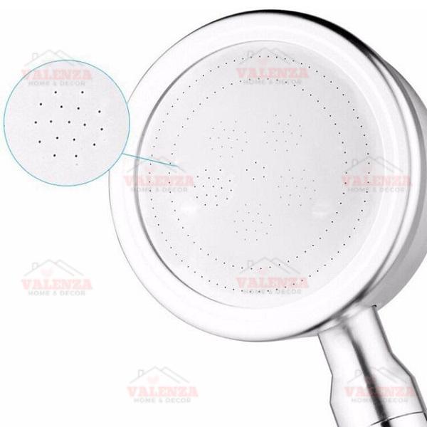Bề mặt vòi sen tăng áp có nhiều lỗ thoát nước nhỏ li ti được bố trí hài hoà, dày đặc vừa tăng áp lực nước vừa tạo dòng nước nhẹ nhàng mát xa cơ thể