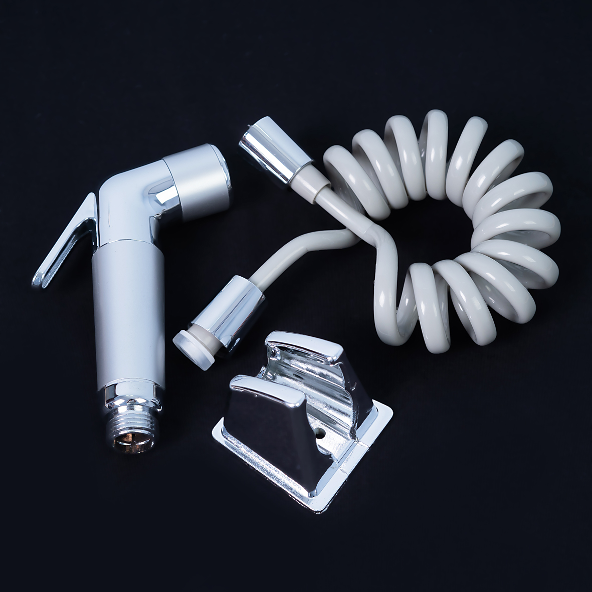 Bộ sản phẩm bao gồm: 01 đầu vòi xịt + 01 dây dẫn nước lò xo + 01 gác tay xịt - ốc vít và tắc kê bắt tường.