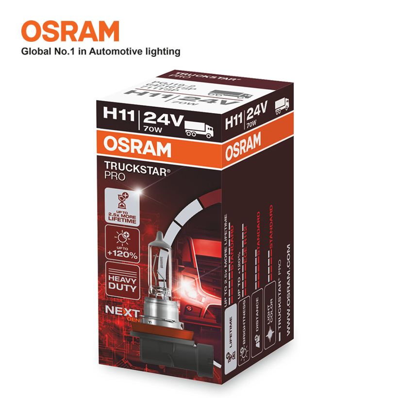 - Bóng Đèn Halogen Tăng Sáng 120% OSRAM Truckstar Pro H11 24V 70W được chế tạo bằng thủy tinh cao cấp đạt tuổi thọ sử dụng cao thêm 2.5 lần giúp hỗ trợ chiếu sáng hiệu quả trên những chặng đường dài