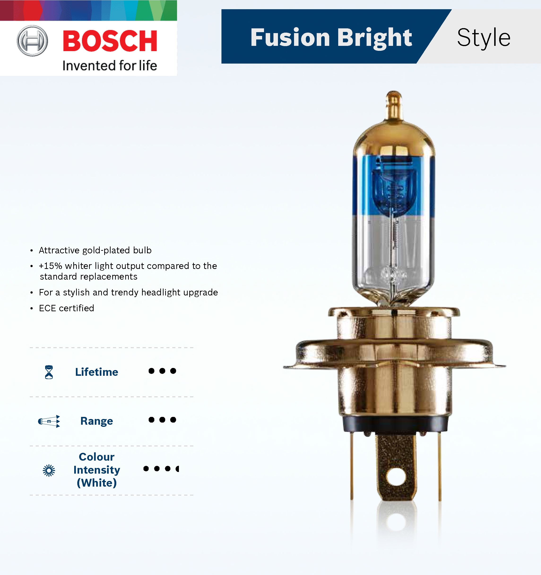 • Công nghệ chiếu sáng Bosch mang ánh sáng vượt trội trên mọi nẻo đường, cho tầm nhìn rộng hơn vào ban đêm hay cả trong những điều kiện thời tiết khắc nghiệt, đảm bảo