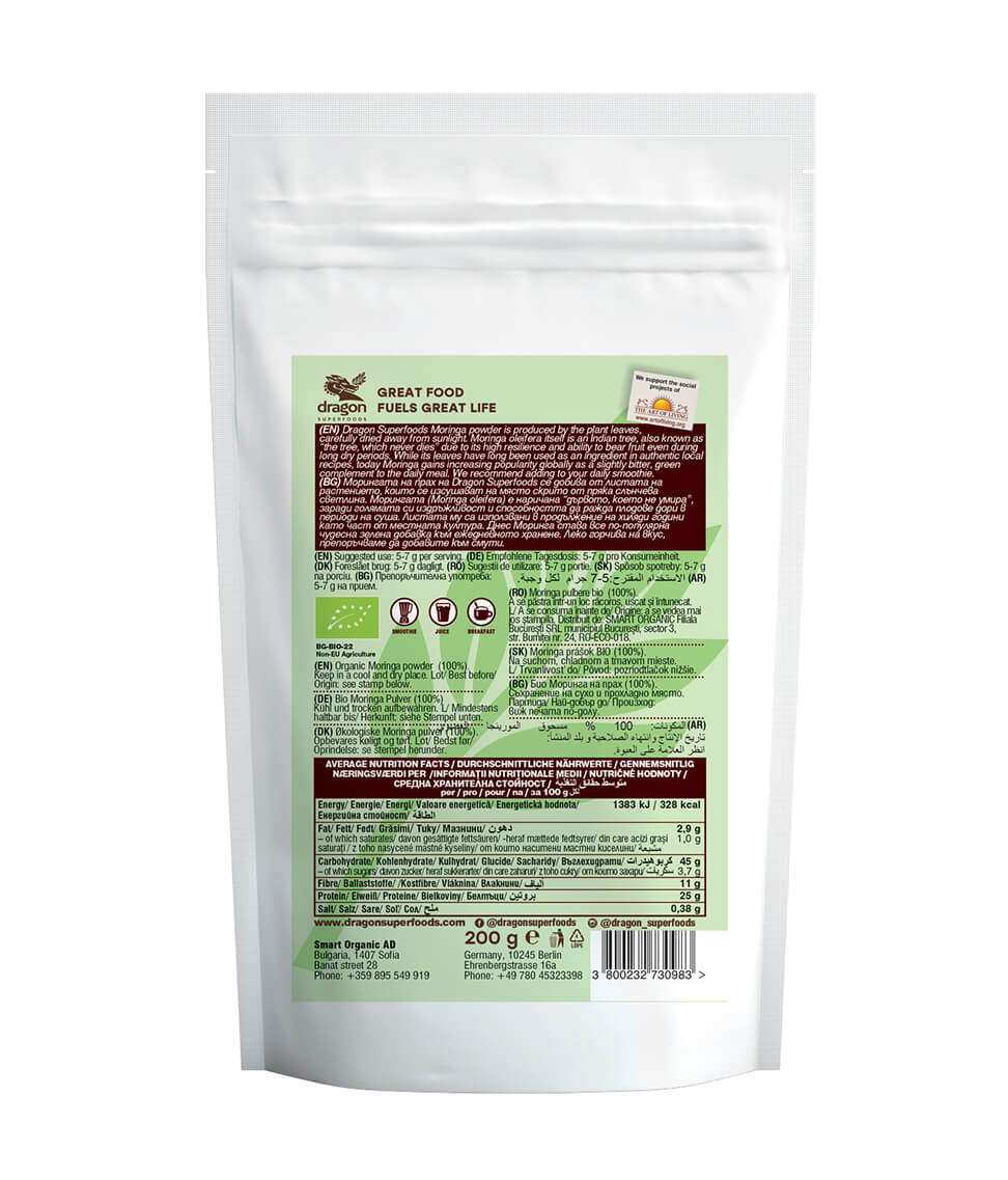Chứng nhận hữu cơ Châu Âu Chứng nhận hữu cơ của sản phẩm bởi BG-BIO-22 ️Nhà phần phối: Smart Organic ️Thương hiệu: Smart Organic ️Xuất xứ: Bulgaria Bột chùm ngây hữu cơ Dragon Superfoods được sản xuất bằng lá cây, được sấy khô cẩn thận, tránh ánh sáng mặt trời. Cây chùm ngây là một loài cây của Ấn Độ, còn được gọi là “cây không bao giờ chết” do khả năng phục hồi cao và có khả năng kết trái ngay cả trong thời gian khô hạn kéo dài. Trong khi lá của nó từ lâu đã được sử dụng như một thành phần trong các công thức nấu ăn địa phương, ngày nay chùm ngây ngày càng trở nên phổ biến trên toàn cầu như một loại thực phẩm bổ sung có vị hơi đắng. Bột chùm ngây Dragon Superfoods được sản xuất bằng lá cây chất lượng cao.