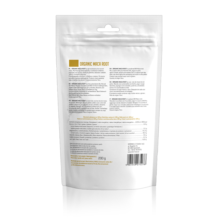 Bột MaCa có tên khoa học là Lepidium meyenii, đôi khi được gọi là nhân sâm Peru. Nó thường được gọi là 'siêu thực phẩm' vì đặc điểm giàu chất dinh dưỡng của nó. MaCa nhiều chất xơ và là nguồn cung cấp protein, canxi, sắt và phốt pho, nó chủ yếu phát triển ở dãy Andes của miền trung Peru, trong điều kiện khắc nghiệt và ở độ cao rất cao Bột MaCa hữu cơ có nguồn gốc từ rễ thích nghi được công nhận là có khả năng tăng cường năng lượng, giảm căng thẳng và thậm chí tăng cường ham muốn. Có nguồn gốc từ Peru, bột maca chất lượng cao của chúng tôi cung cấp một nguồn chất xơ, canxi, sắt, magiê và axit amin dồi dào. Bột MaCa hữu cơ có vị bơ ngọt nhẹ và dễ chịu, giúp bạn dễ dàng kết hợp vào thức uống và thực phẩm hàng ngày. Thu hoạch và chọn lọc bằng tay. Được nghiền mịn và sấy khô bằng quy trình công nghệ cao mà không bị can thiệp bởi hóa chất và nhiệt độ cao để bảo toàn tất cả dưỡng chất, vitamin, hương vị và màu sắc… Dạng bột để sử dụng thuận tiện nhất. Bột MaCa được xác định là một trong những thực phẩm có đặc tính tăng cường sức khỏe đặc biệt. Nó là rễ của một loại rau có nguồn gốc từ Andes. MaCa được coi là một sản phẩm có khả năng thích ứng, mang lại cho cơ thể và tâm trí của bạn khả năng thích ứng với căng thẳng, lo lắng hoặc trầm cảm, và tăng sức chịu đựng về tâm sinh lý cũng như năng lượng của cơ thể. MaCa được coi như một chất hỗ trợ tình dục. Chúng tăng số lượng tinh trùng, cải thiện khả năng sinh sản. Đối với phụ nữ, chúng có thể làm dịu các triệu chứng mãn kinh như bốc hỏa. Ngoài ra, MaCa là một nguồn tập trung của protein, canxi, magiê, sắt, axit amin và vitamin. Những chất này thúc đẩy các tế bào khỏe mạnh, giữ cho quá trình trao đổi chất của chúng ta đi đúng hướng, giúp tiêu hóa và kéo căng cơ bắp sau khi tập luyện. Bột MaCa cũng có thể cải thiện tâm trạng và giúp bạn tăng năng lượng tích cực. MaCa cũng được cho là hỗ trợ chức năng hệ thống miễn dịch, bảo vệ gan và kích thích hoạt động trí tuệ. MaCa đặc biệt thích hợp cho những người muốn tăng cường hiệu lực giới tính của họ và điều chỉnh hệ thống thần kinh. Bột MaCa là một nguồn cung cấp vitamin và khoáng chất phức hợp B như canxi, kẽm và sắt. Hàm lượng chất xơ cao trong maca hỗ trợ hệ tiêu hóa khỏe mạnh và giúp ổn định lượng đường trong máu. Với bảy loại axit amin thiết yếu, bột maca là một nguồn protein gần như hoàn chỉnh. Siêu thực phẩm cung cấp năng lượng này là một cách tuyệt vời để tăng lượng chất dinh dưỡng của bạn Hương vị trái cây ngọt ngào của nó kết hợp hoàn hảo với nhiều món ăn và đồ uống. Bạn có thể thêm Bột MaCa vào cà phê, sữa sô cô la, sinh tố bơ, granola, yến mạch, sữa chua hoặc súp.