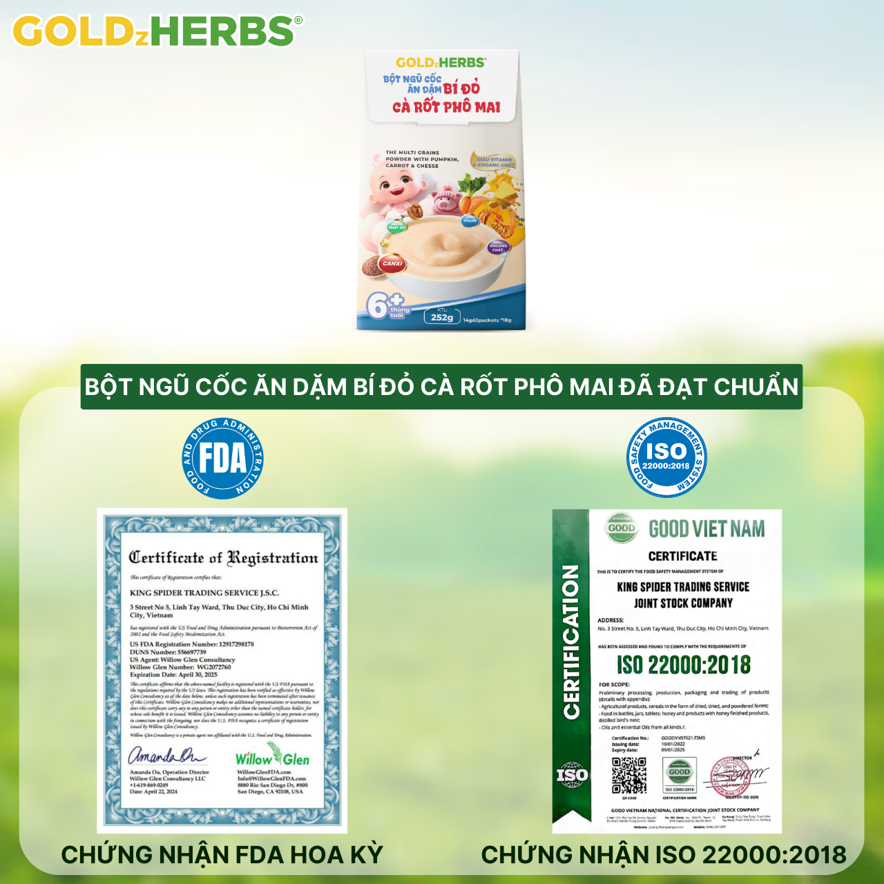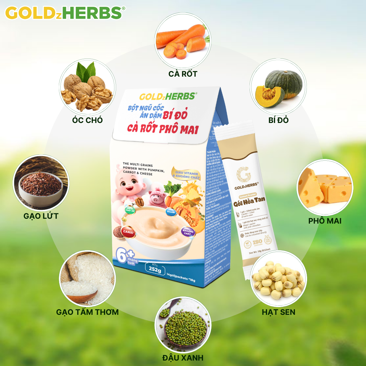 ✨Bột ngũ cốc ăn dặm bí đỏ cà rốt phô mai GoldzHerbs cho bé từ 6 tháng tuổi – 250g/ 500g