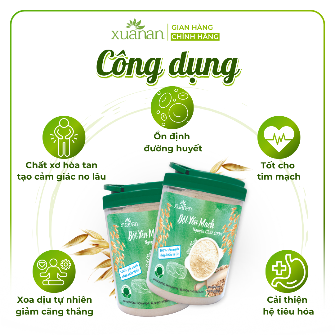 Bột Yến Mạch nguyên cám nguyên chất 100% giàu dinh dưỡng, chất xơ, vitamin, đạm và dưỡng chất tự nhiên. Tiện lợi dùng làm bánh, quấy bột cho trẻ nhỏ hoặc dùng làm nguyên liệu chế biến bữa ăn trong gia đình. 100% Yến mạch nguyên chất Xuân An (Instant Oats) được nhập khẩu từ ÚC.