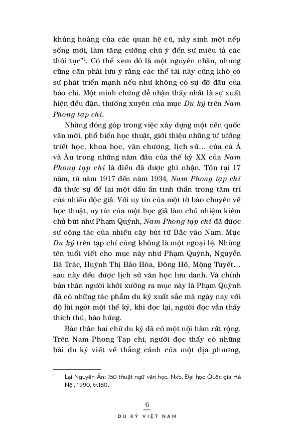 Những đóng góp của Tạp chí Nam Phong (1917 - 1934) trong việc xây dựng một nền quốc văn mới, phổ biến học thuật, giới thiệu những tư tưởng triết học, khoa học, văn chương, lịch sử… của cả Á và Âu trong những năm đầu của thế kỷ XX là điều đã được ghi nhận. Tồn tại 17 năm, từ năm 1917 đến năm 1934, Nam Phong tạp chí đã thực sự để lại một dấu ấn tinh thần trong tâm trí của nhiều độc giả. Với uy tín của một tờ báo chuyên về học thuật, uy tín của một học giả làm chủ nhiệm kiêm chủ bút như Phạm Quỳnh, Nam Phong tạp chí đã được sự cộng tác của nhiều cây bút từ Bắc vào Nam. Mục Du ký trên tạp chí cũng không là một ngoại lệ. Những tên tuổi viết cho mục này như Phạm Quỳnh, Nguyễn Bá Trác, Huỳnh Thị Bảo Hòa, Đông Hồ, Mộng Tuyết… sau này đều được lịch sử văn học lưu danh. Và chính bản thân người khởi xướng ra mục này là Phạm Quỳnh đã có những tác phẩm du ký xuất sắc mà ngày nay với độ lùi ngót một thế kỷ, khi đọc lại, người đọc vẫn thấy thích thú, hào hứng.